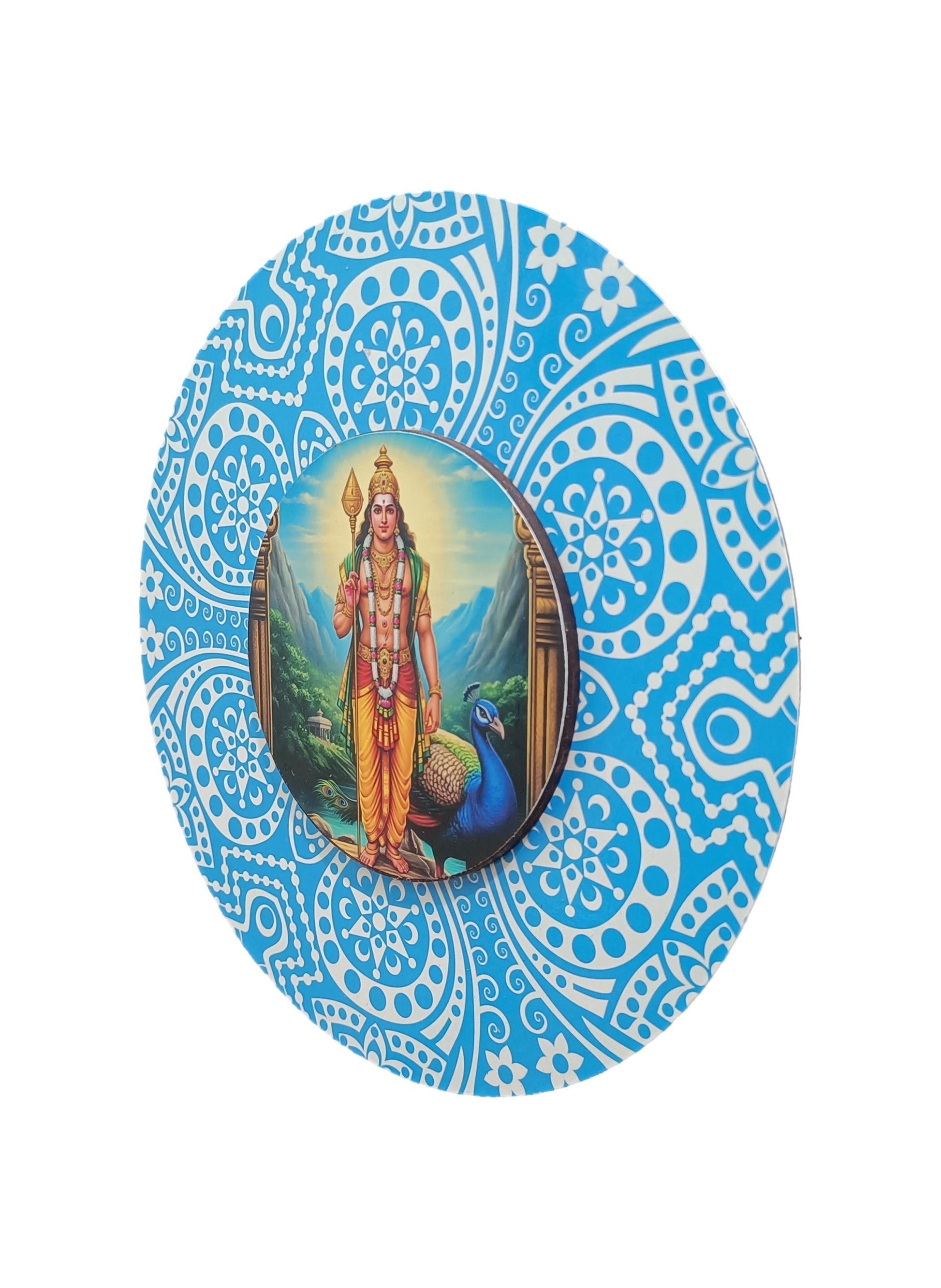 This graceful decorative piece features Lord Murugan standing majestically with the Vel (spear), symbolizing divine power and protection. Positioned beside him is his sacred peacock, adding spiritual significance and vibrancy to the artwork.