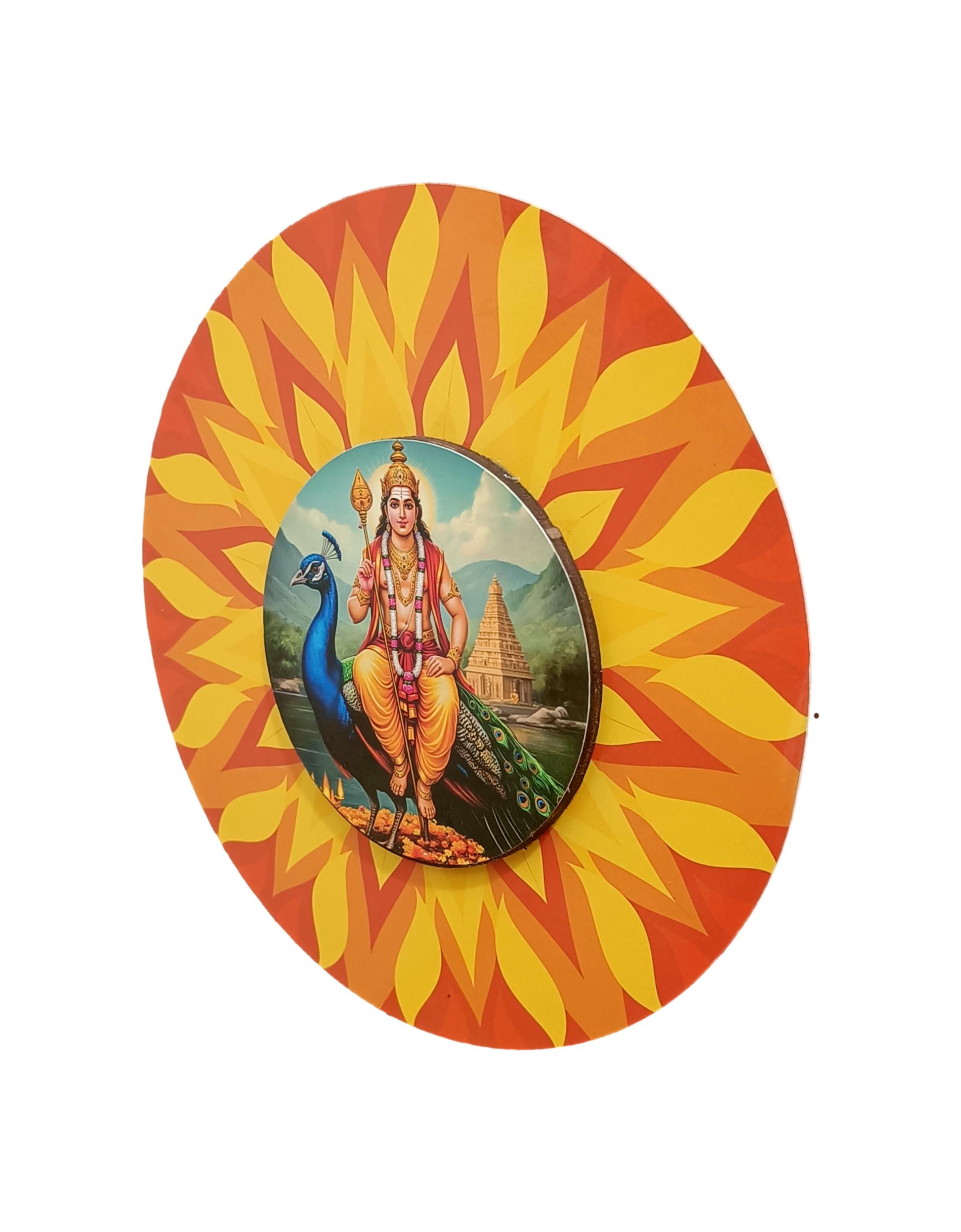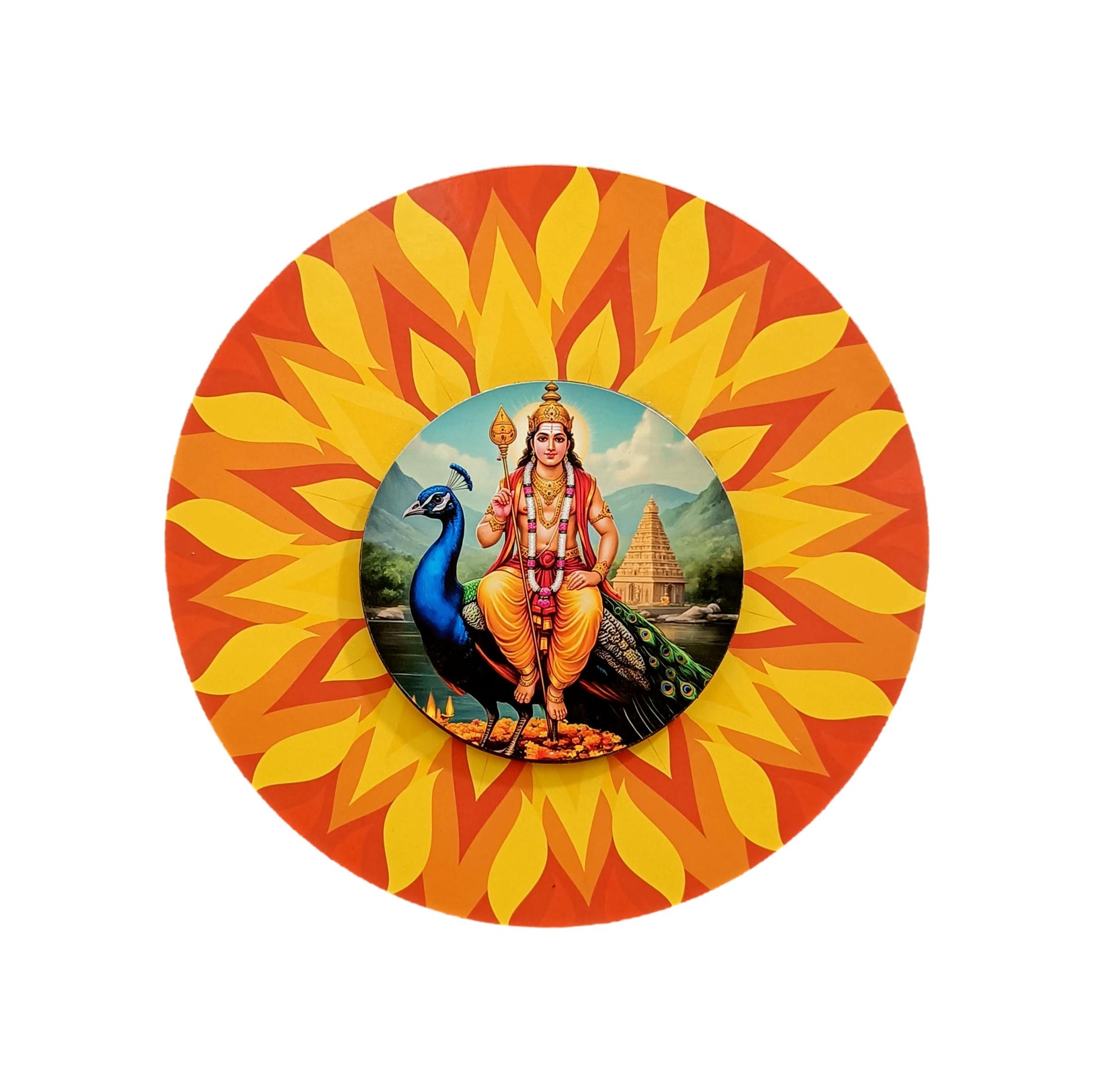 This exquisite wooden wall hanging showcases Lord Murugan majestically seated on his divine peacock, set within a round frame adorned with a detailed floral background. Expertly handcrafted from quality wood, the artwork captures the deity’s grace and power with fine detailing and traditional charm.