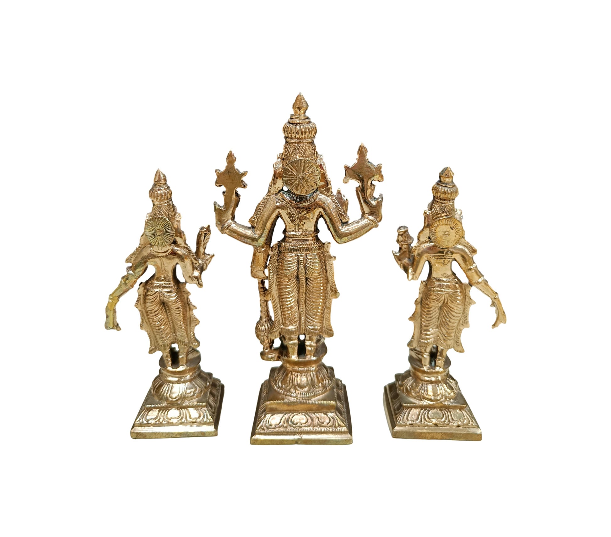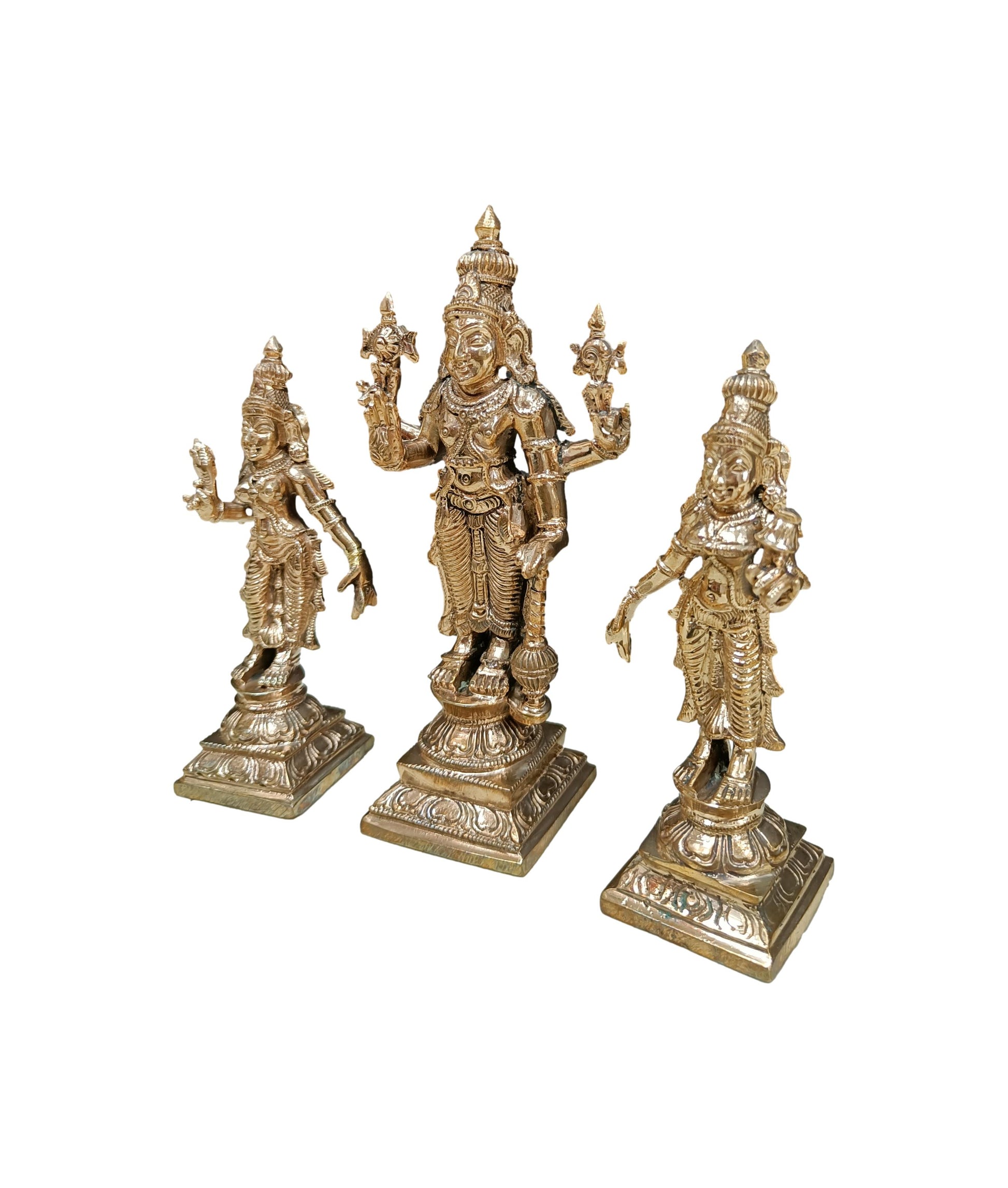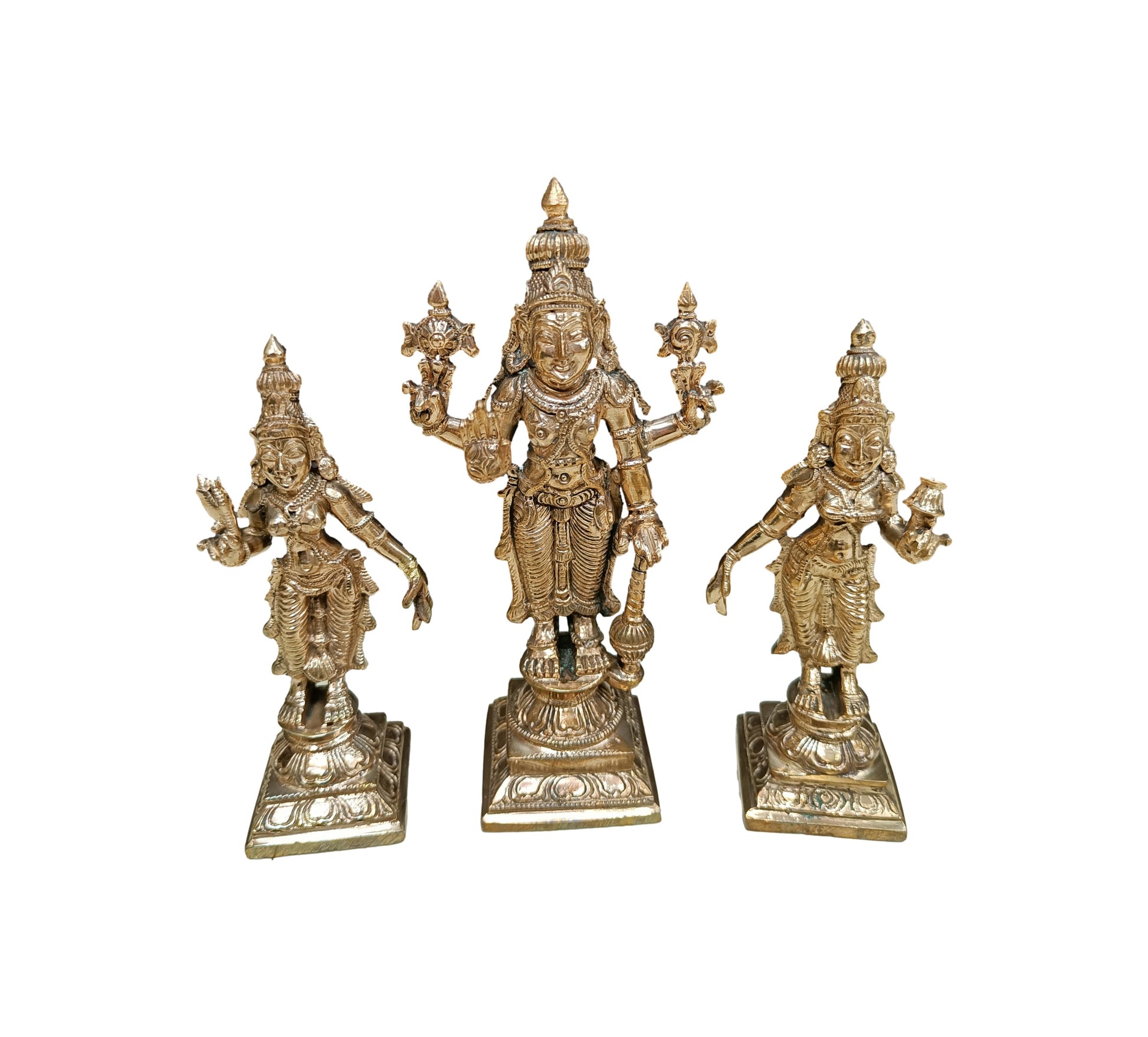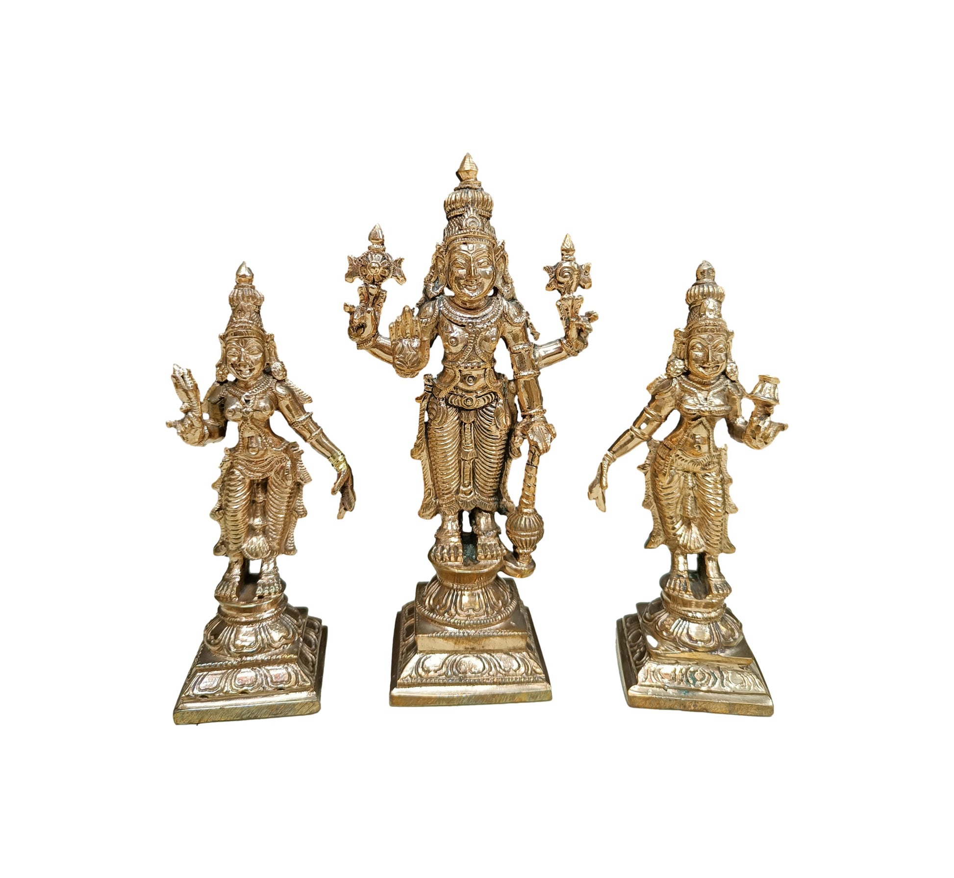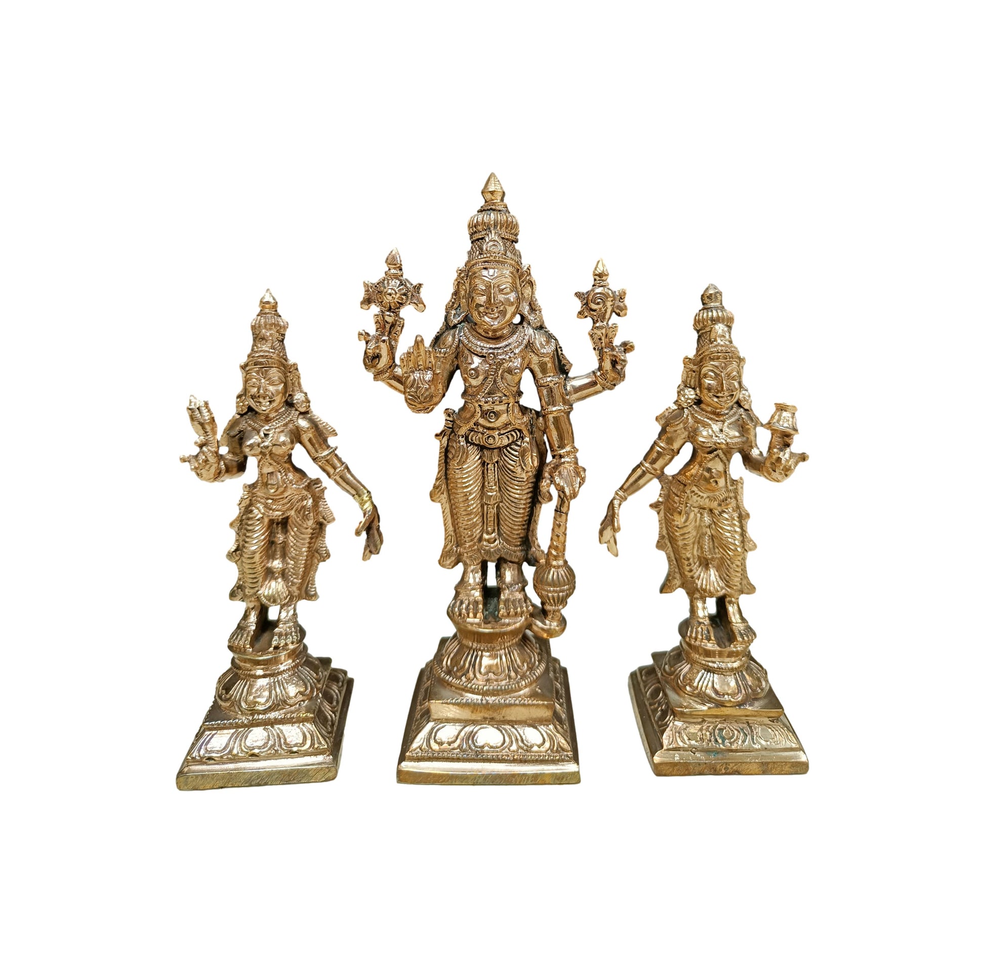 A Panchalogam Perumal with Sridevi and Bhudevi idol is a scared and intricately crafted representation of Lord Vishnu [Perumal] accompanied by his divine consorts, Goddess Sridevi [Lakshmi, symbolizing wealth and prosperity] and Goddess Bhudevi [representing the earth and abundance].These idols are ideal for pooja rooms, temples, or home decor, fostering peace, prosperity, and spiritual connection