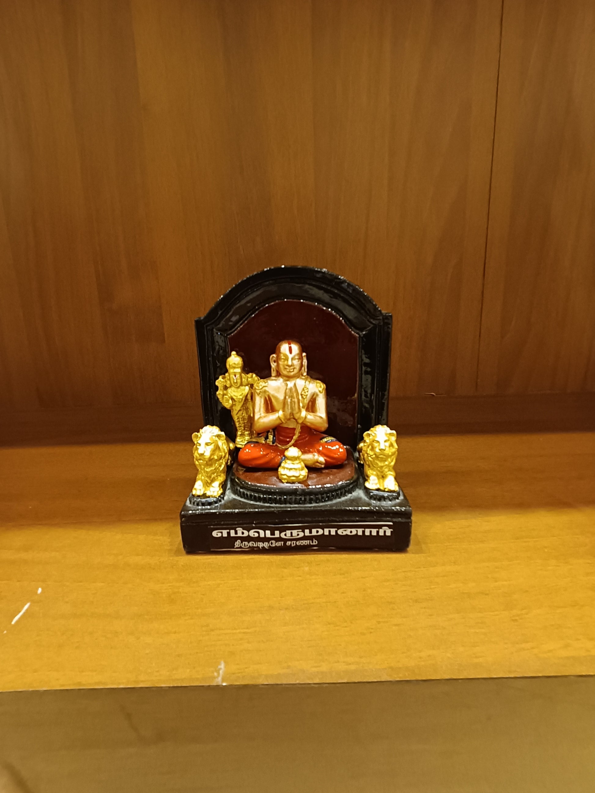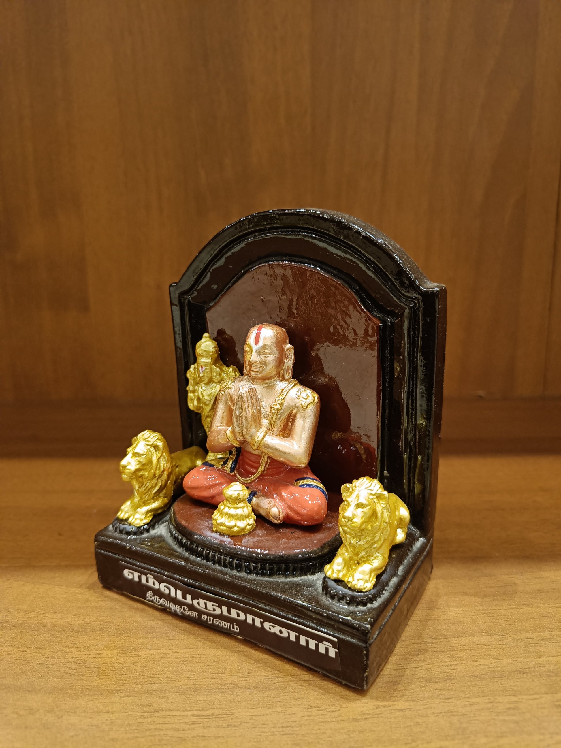 This intricately crafted Sri Ramanujacharya idol is made from durable fiber resin, showing the revered Vaishnava acharya in a seated posture (asana), flanked by lion motifs on both sides—symbols of spiritual authority and divine power. The side panel also features a graceful image of Lord Perumal (Vishnu), highlighting Ramanuja’s eternal service to the Supreme Lord.