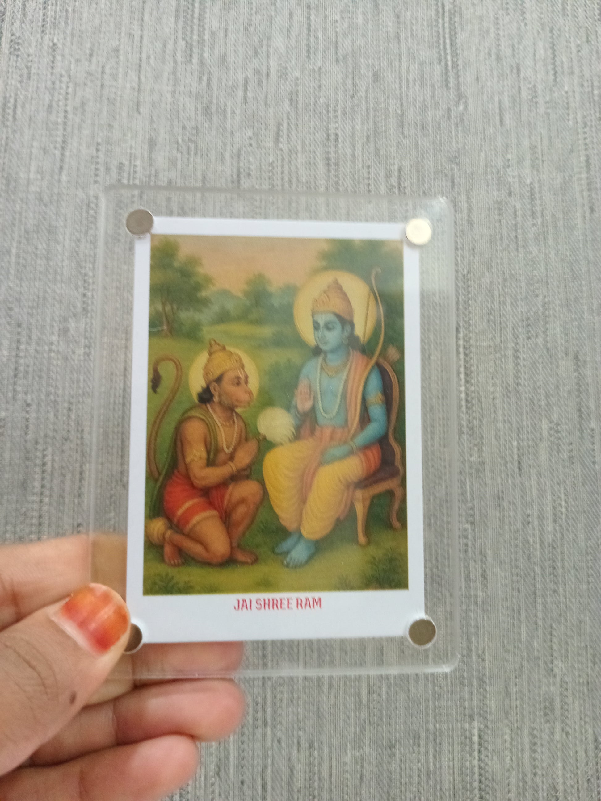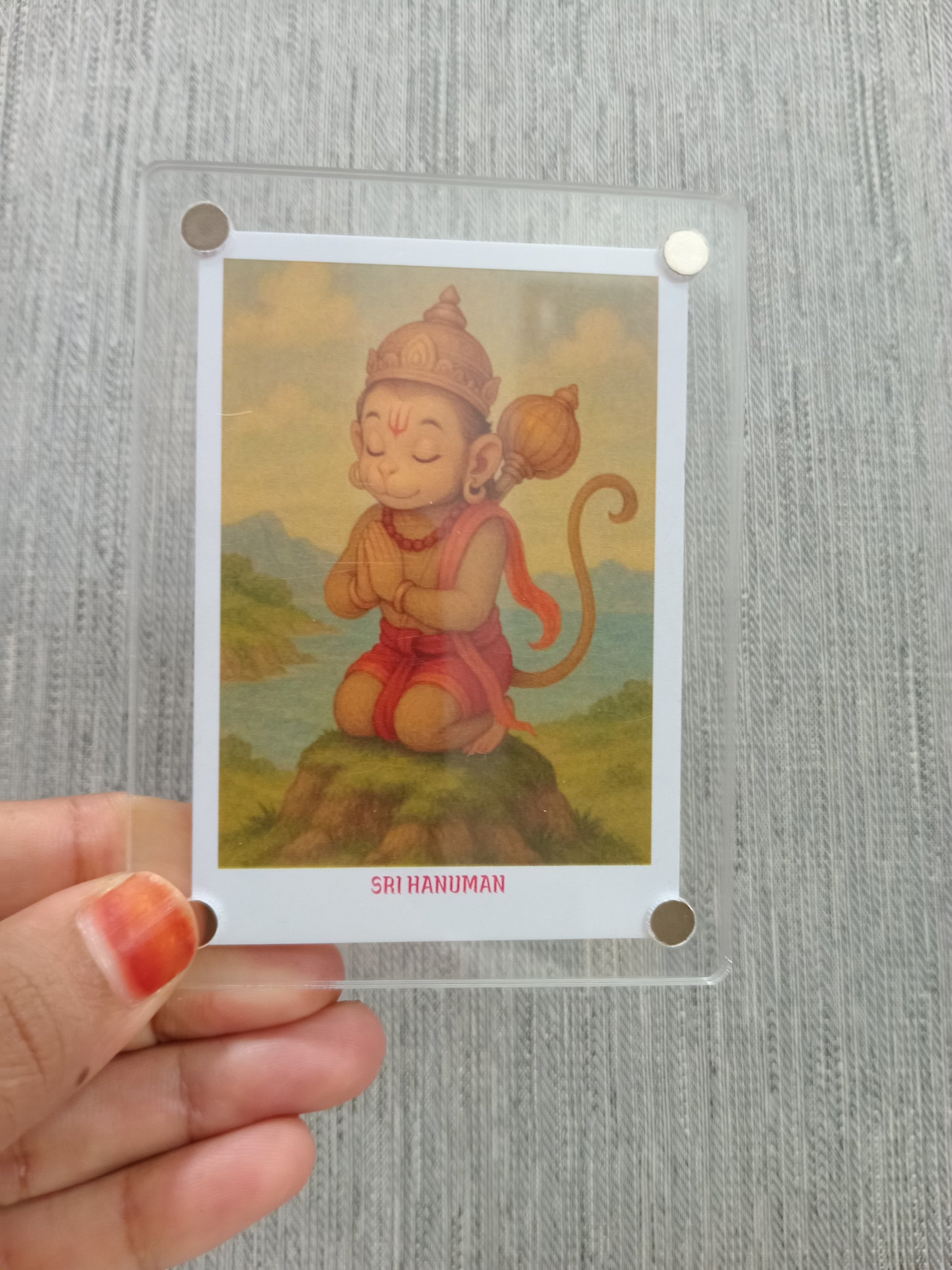 Celebrate devotion with our Hanuman Polaroid fridge magnet. This unique magnet captures the divine essence of Hanuman, the embodiment of strength, loyalty, and devotion from the Ramayana, in a charming Polaroid-style design. Perfect for adding a touch of divine inspiration and timeless style to your kitchen decor.