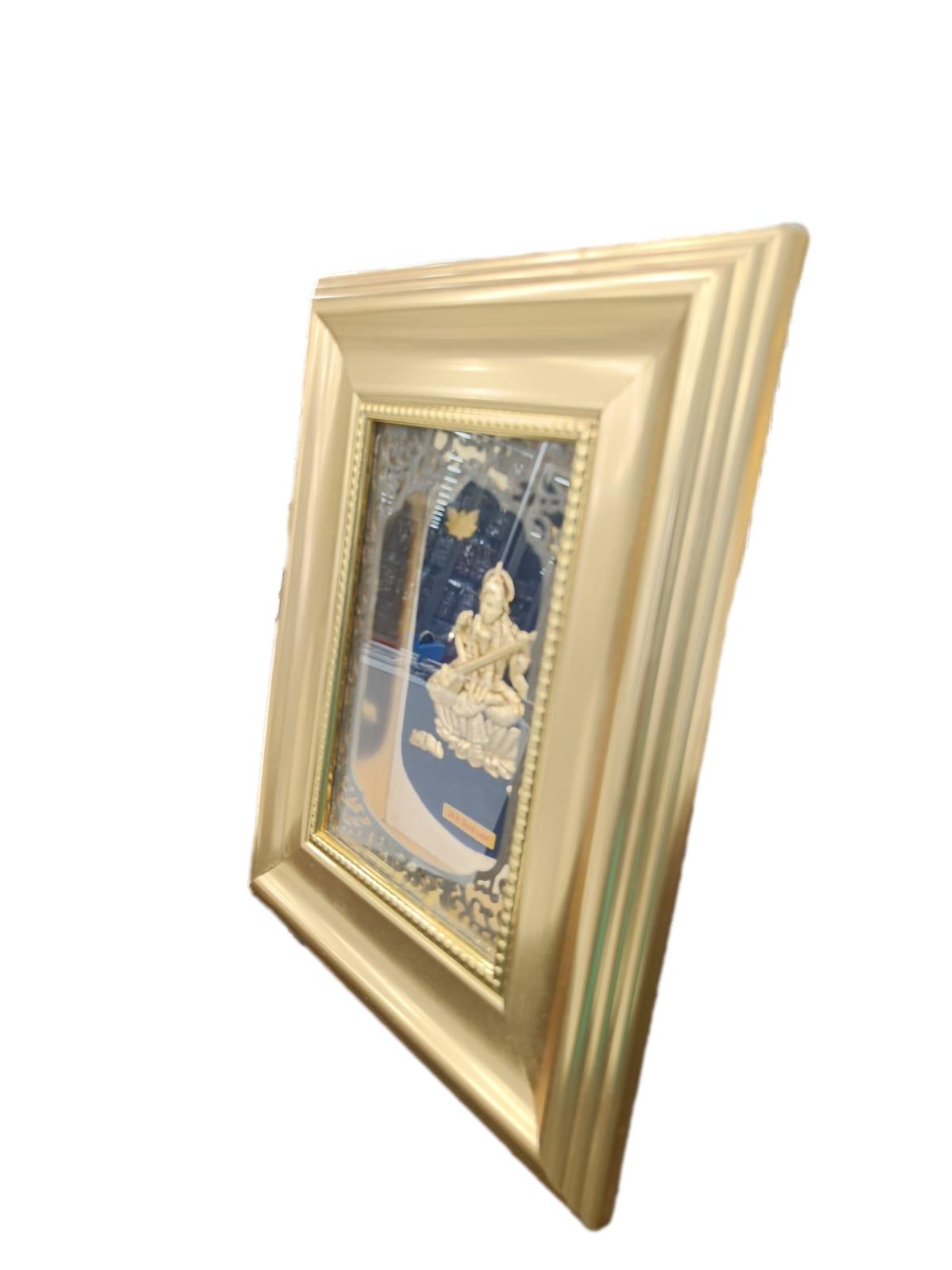 Experience divine elegance with the Lakshmi Sri Saraswathi Devi 24K Gold Foil Photo Frame/Table Stand. This exquisite piece combines intricate artistry with the purity of 24K gold foil, showcasing Goddess Lakshmi and Goddess Saraswathi in their divine glory. Perfect for adorning your home altar or office desk, this frame/table stand exudes prosperity, wisdom, and artistic brilliance. The detailed craftsmanship and shimmering gold accents create a mesmerizing visual impact, making it a cherished addition to your spiritual decor. Whether as a personal devotion item or a thoughtful gift, this frame/table stand radiates auspiciousness and blessings, bringing positivity and abundance into your life.