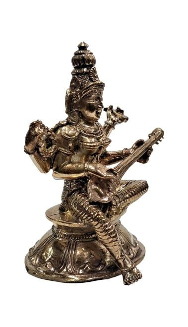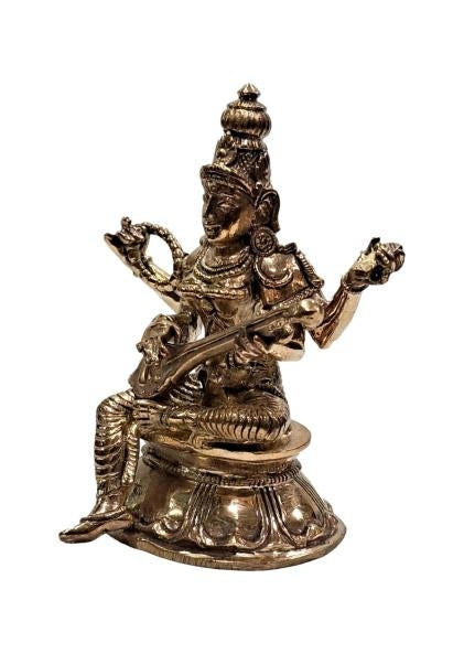 The Sri Saraswathi Panchalogam idol epitomizes divine grace and knowledge. Crafted from a blend of five sacred metals (Panchalogam), this idol showcases intricate detailing and a serene expression, capturing the essence of Goddess Saraswathi. With her veena symbolizing art and wisdom, and the sacred scriptures in her hand representing knowledge, this idol radiates spirituality and creativity. Perfect for home altars, educational institutions, or as a thoughtful gift, it brings blessings of wisdom, learning, and artistic inspiration. The craftsmanship and symbolism make it a cherished addition to any spiritual collection, inviting the presence of Saraswathi's divine grace.