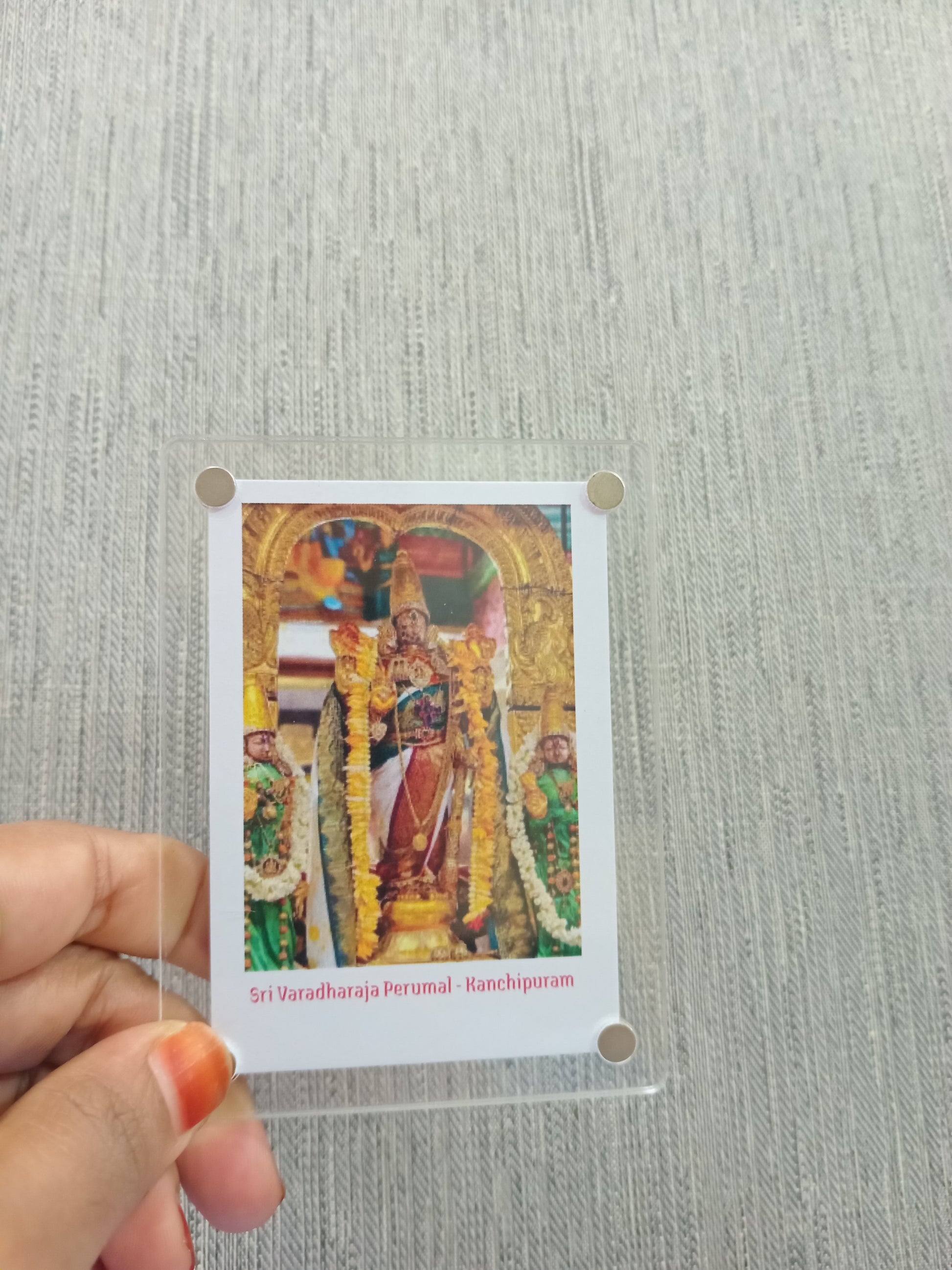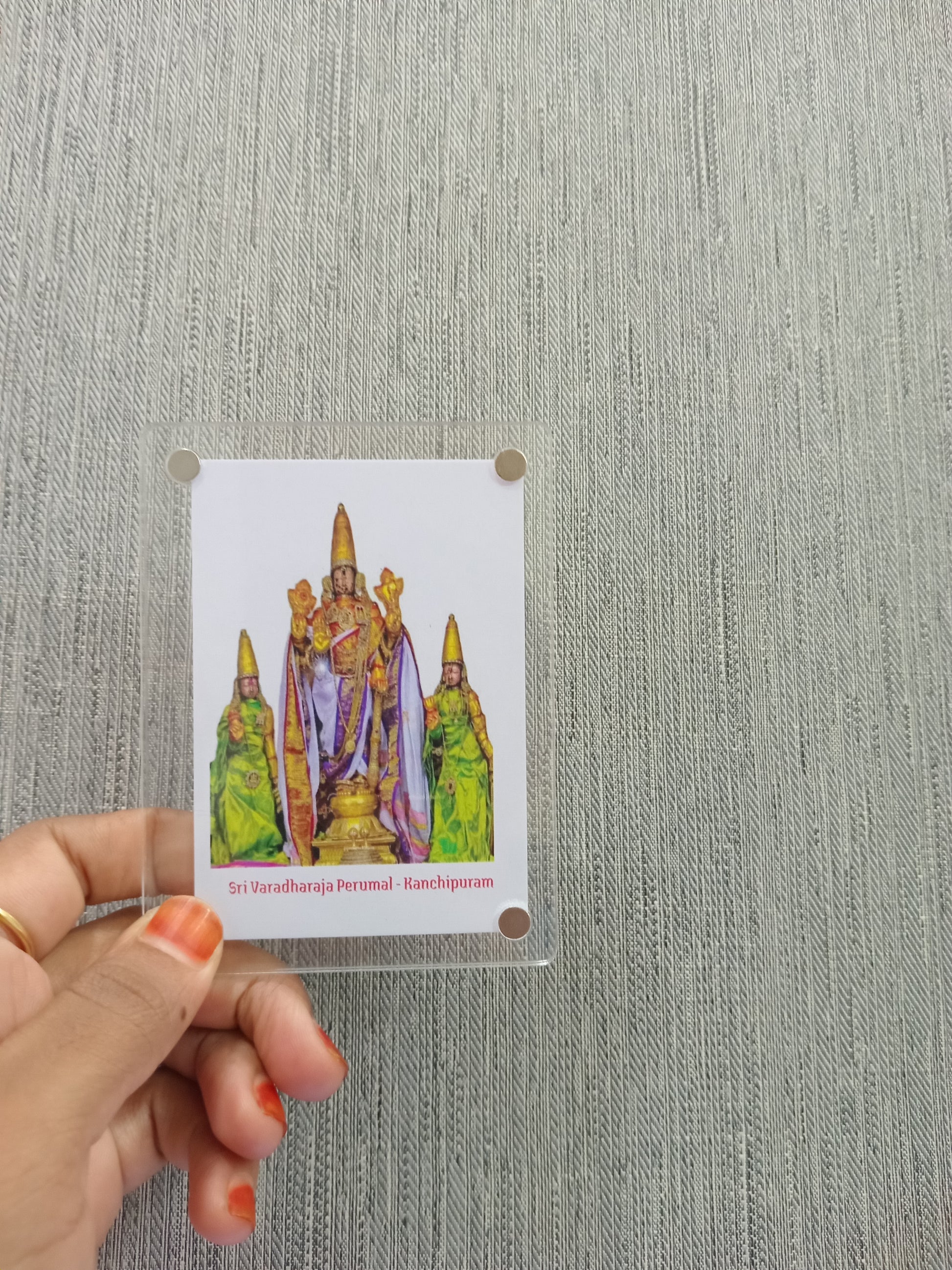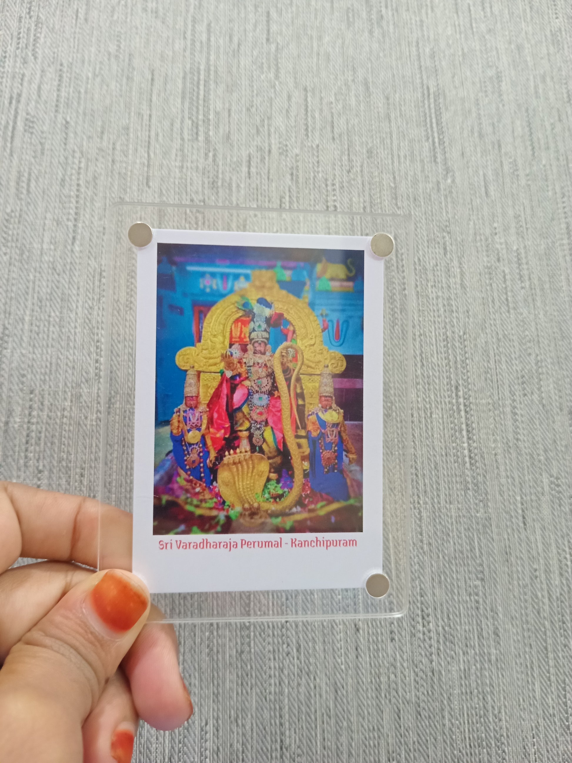 Sri Varadharaja Perumal Polaroid fridge magnet is a personalized, decorative magnet featuring an image of Lord Perumal [a form of Lord Vishnu]styled in a classic Polaroid frame.This magnet serves a both a spiritual keepsake and a decorative piece, bringing blessings and elegance to your home. Perfect for adding a touch of divine inspiration and timeless style to your kitchen decor.