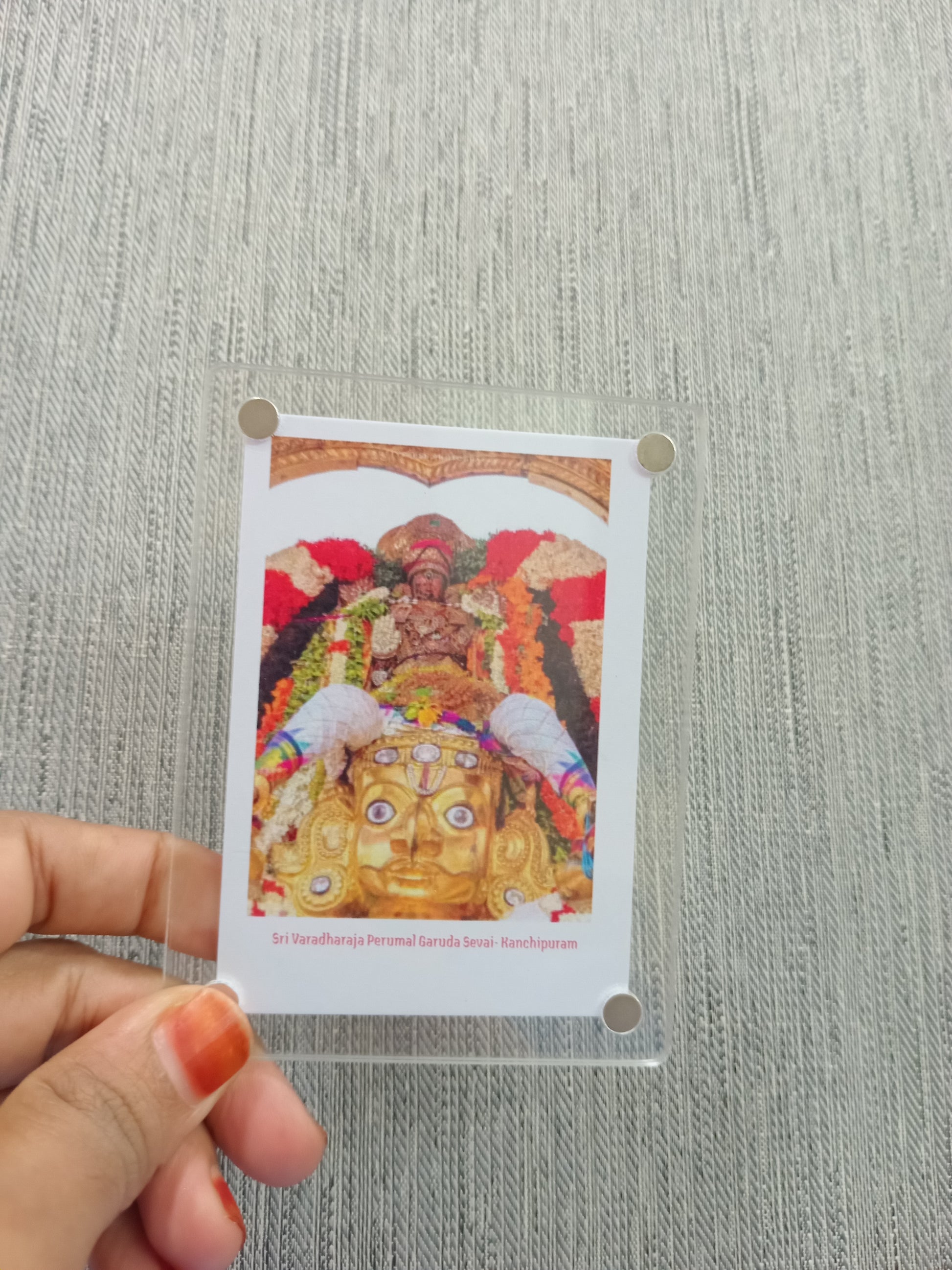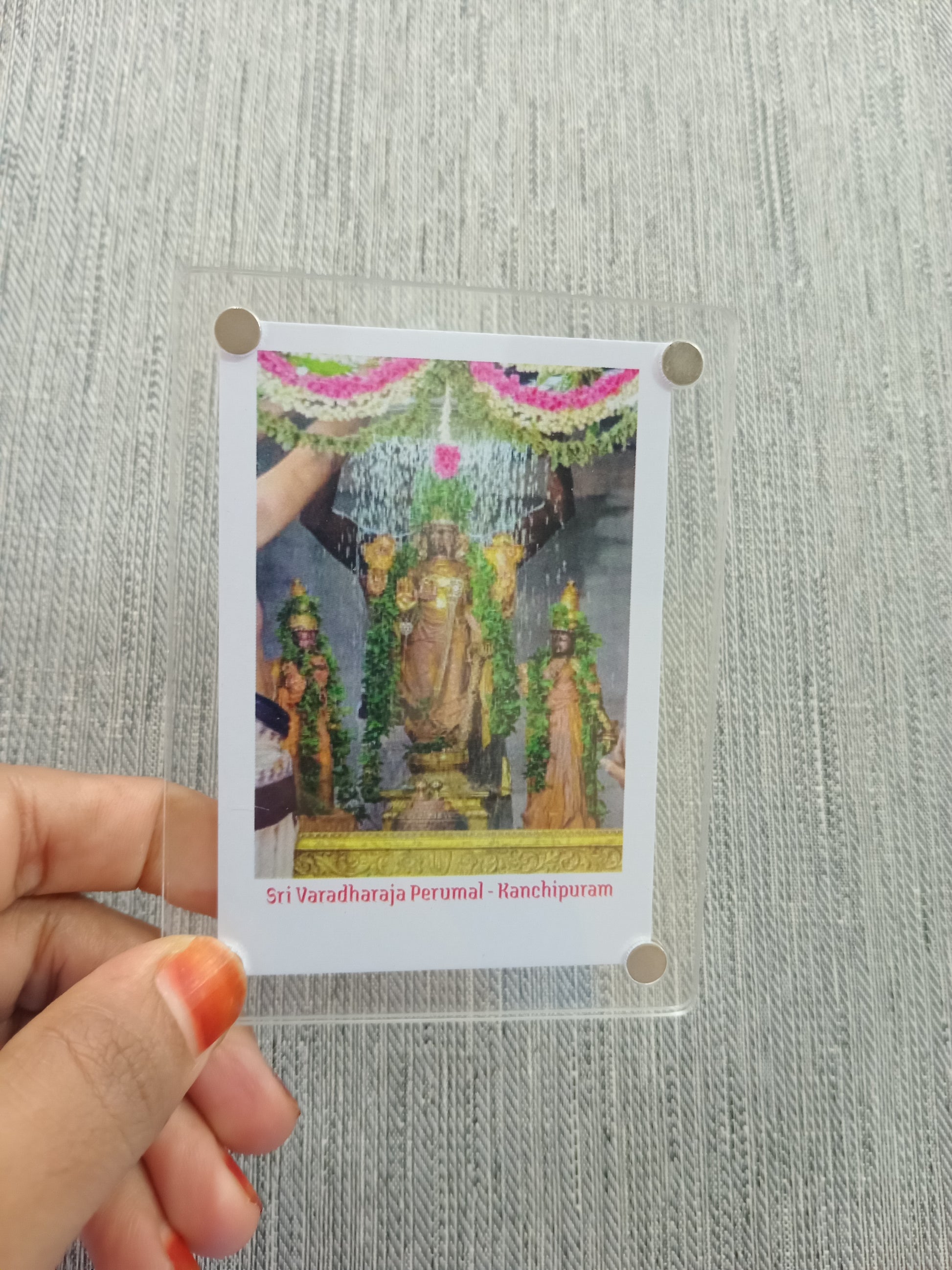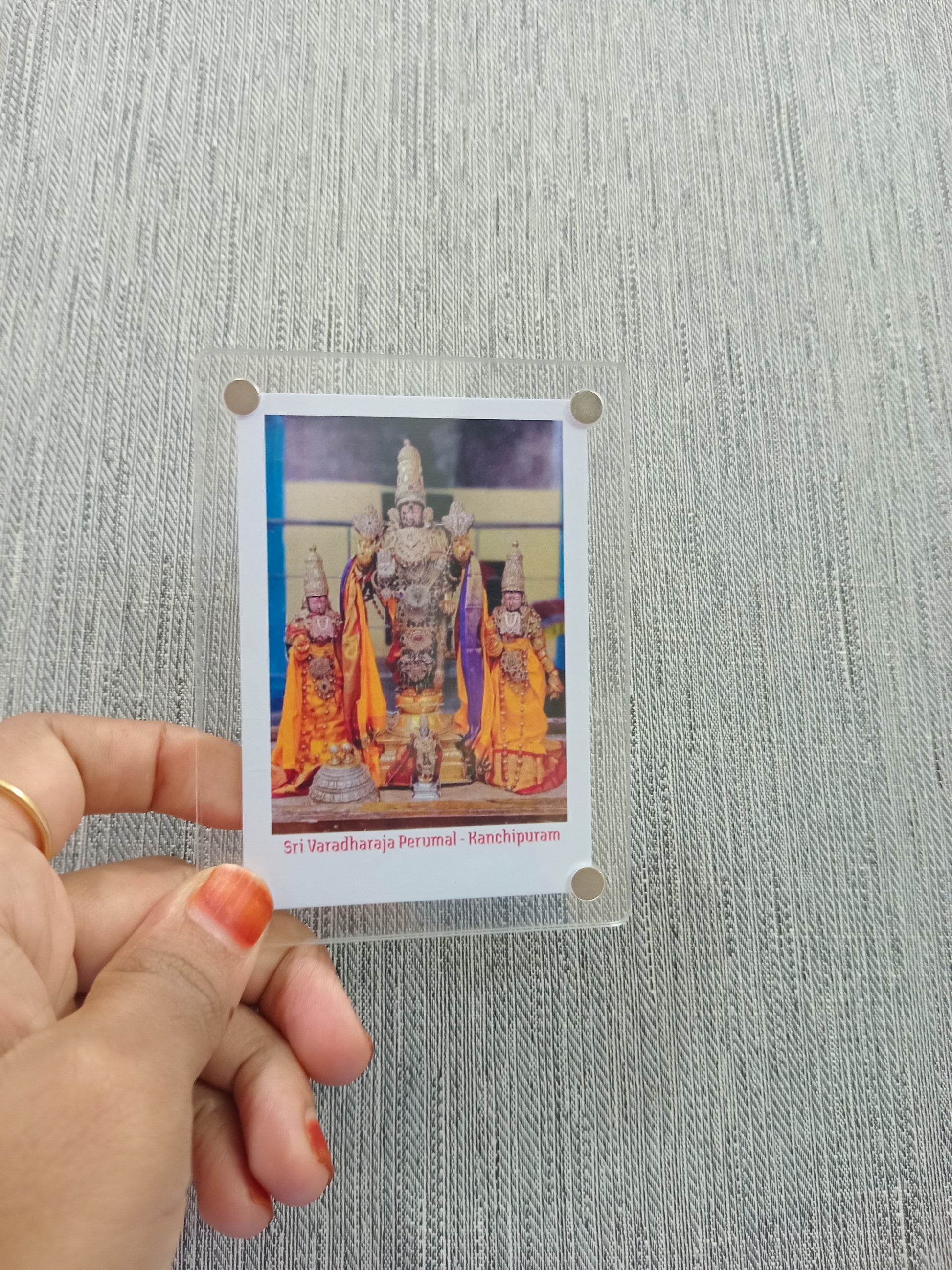 Sri Varadharaja Perumal Polaroid fridge magnet is a personalized, decorative magnet featuring an image of Lord Perumal [a form of Lord Vishnu]styled in a classic Polaroid frame.This magnet serves a both a spiritual keepsake and a decorative piece, bringing blessings and elegance to your home. Perfect for adding a touch of divine inspiration and timeless style to your kitchen decor.
