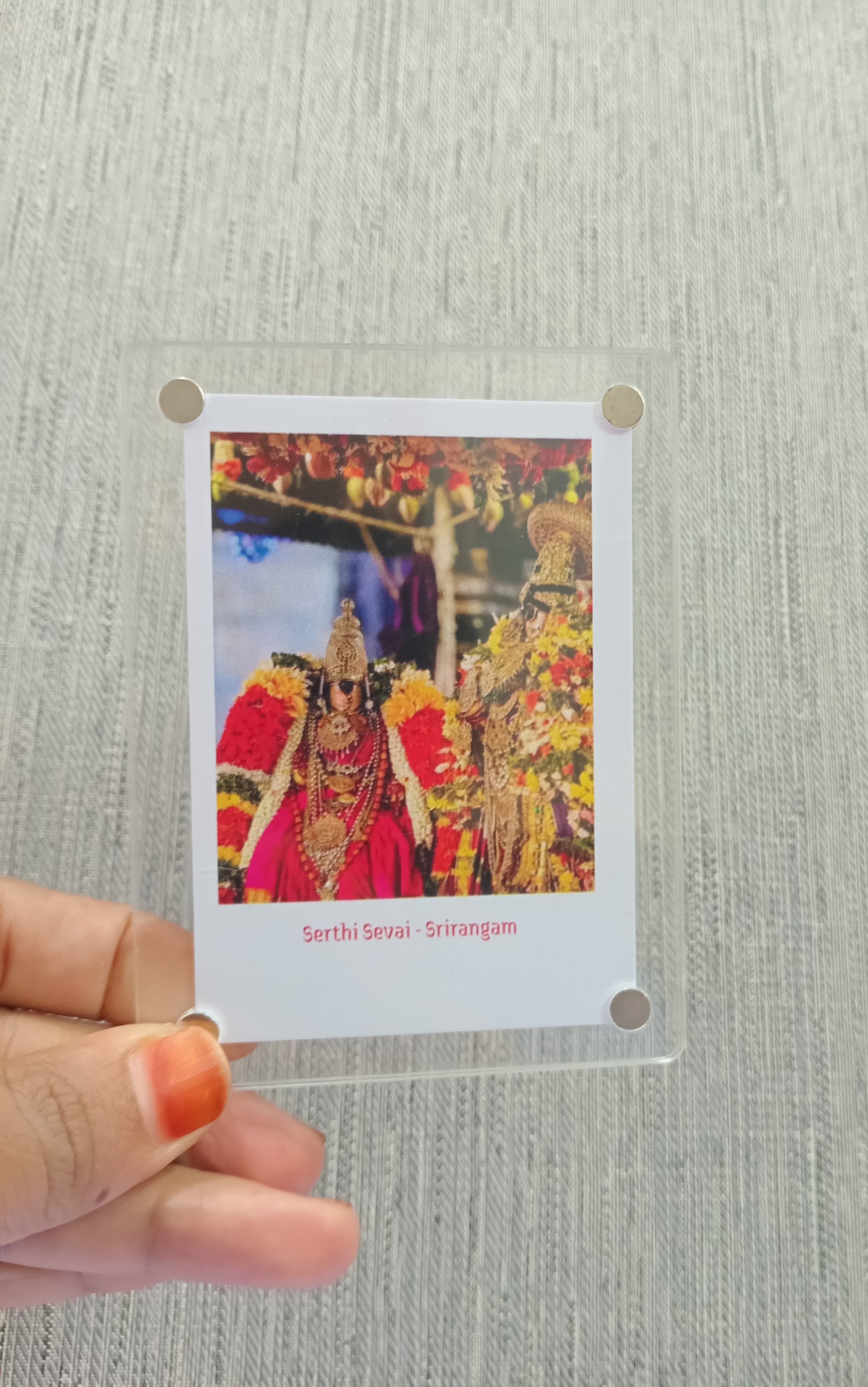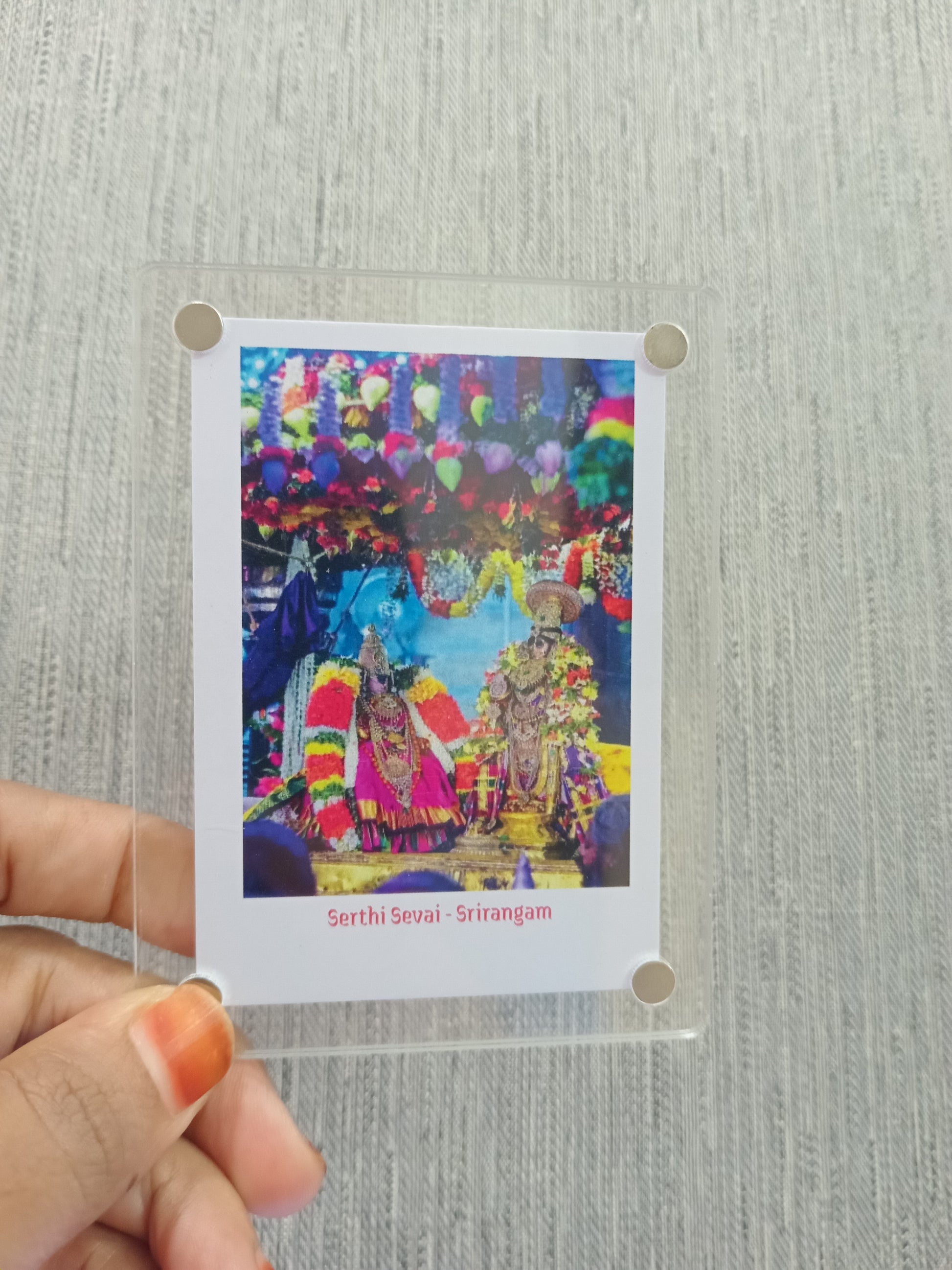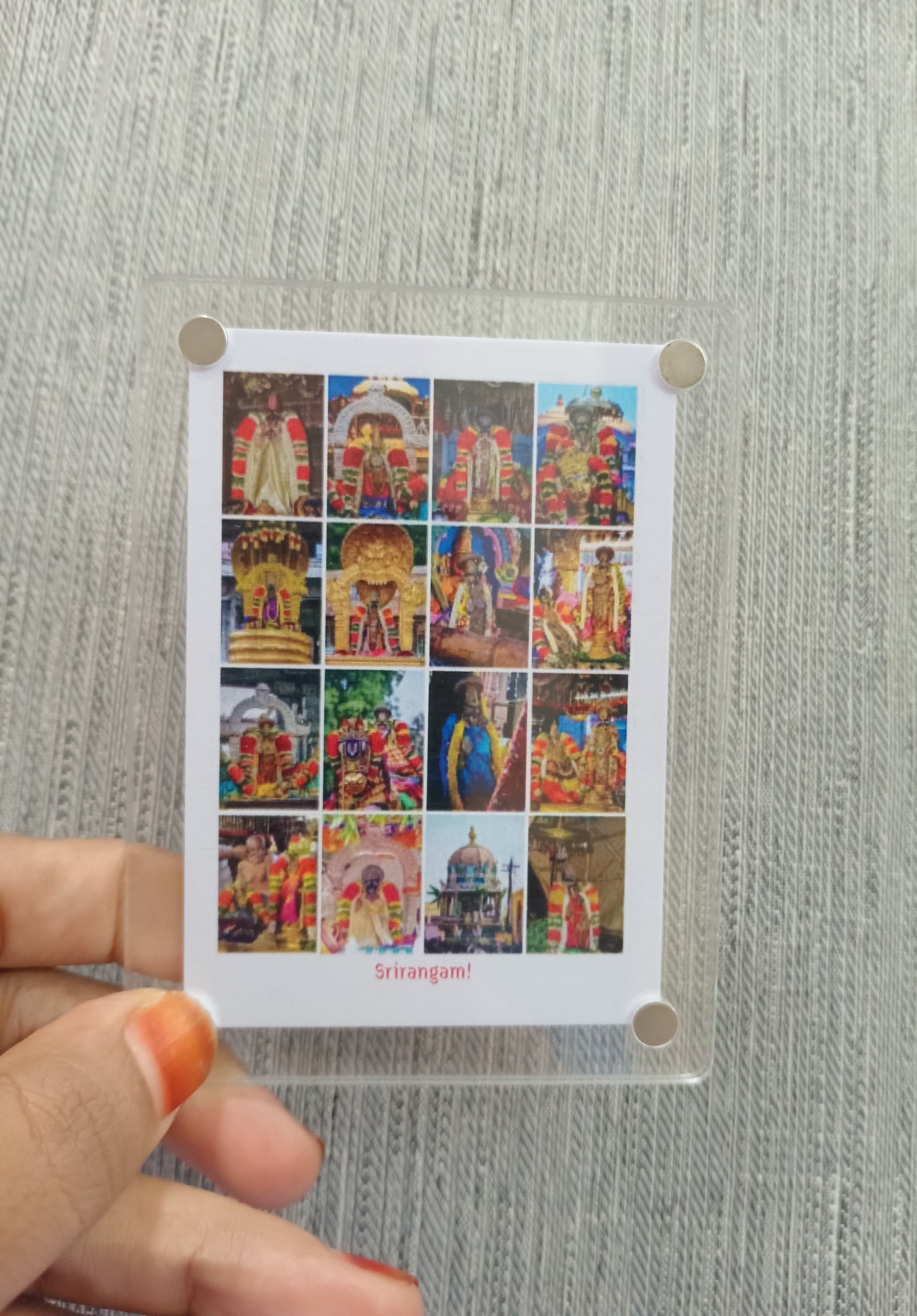 A Srirangam Polaroid fridge magnet is a charming, nostalgic keepsake that captures the essence of the iconic Sri Ranganathaswamy Temple in Srirangam, Tamilnadu. Designed in a classic Polaroid style, this magnet showcase a vibrant, high-quality portrait of the deity, framed with a white border and space for a blessing.Ideal as a spiritual memento or a thoughtful gift, it brings ṭhe divine presence of Sri Ranganatha Swamy into your daily life, blending tradition with retro aesthetics.