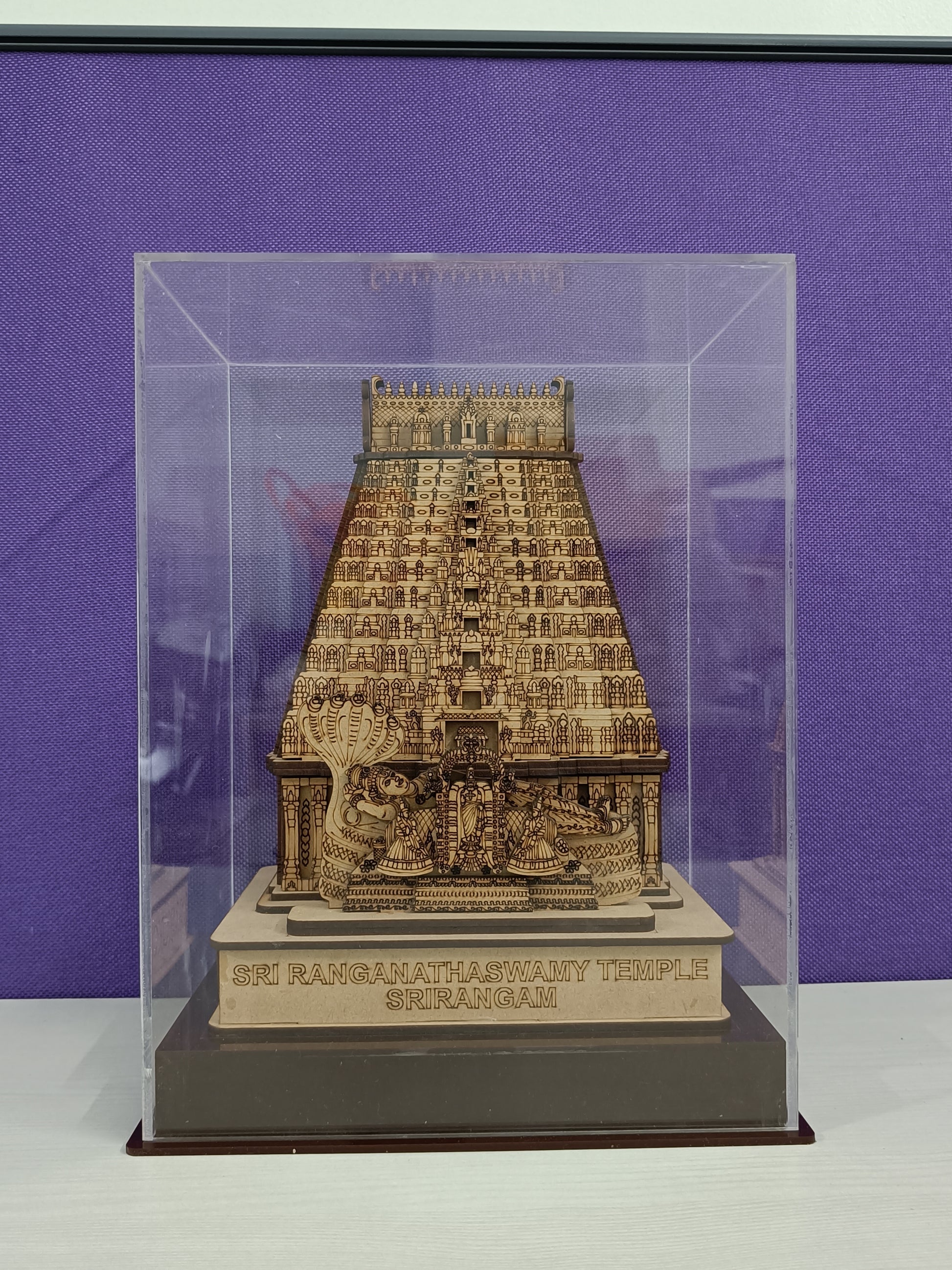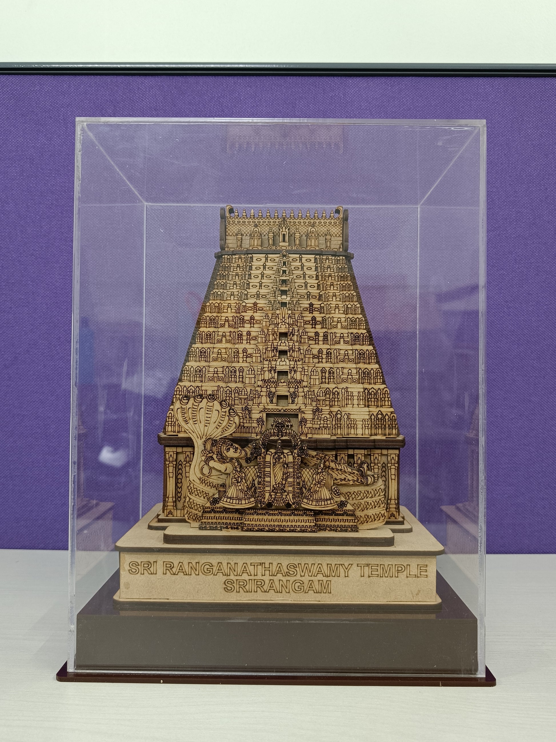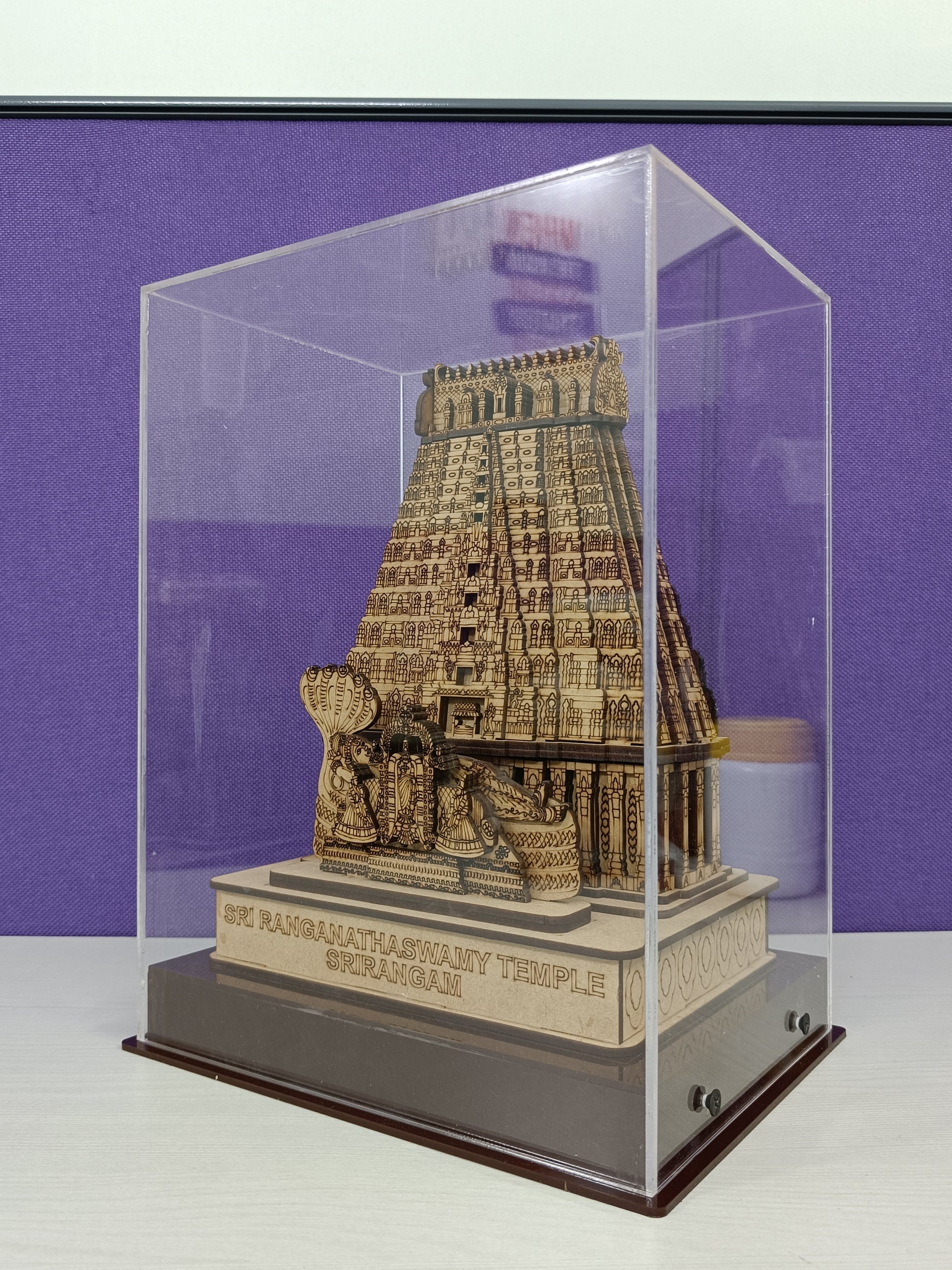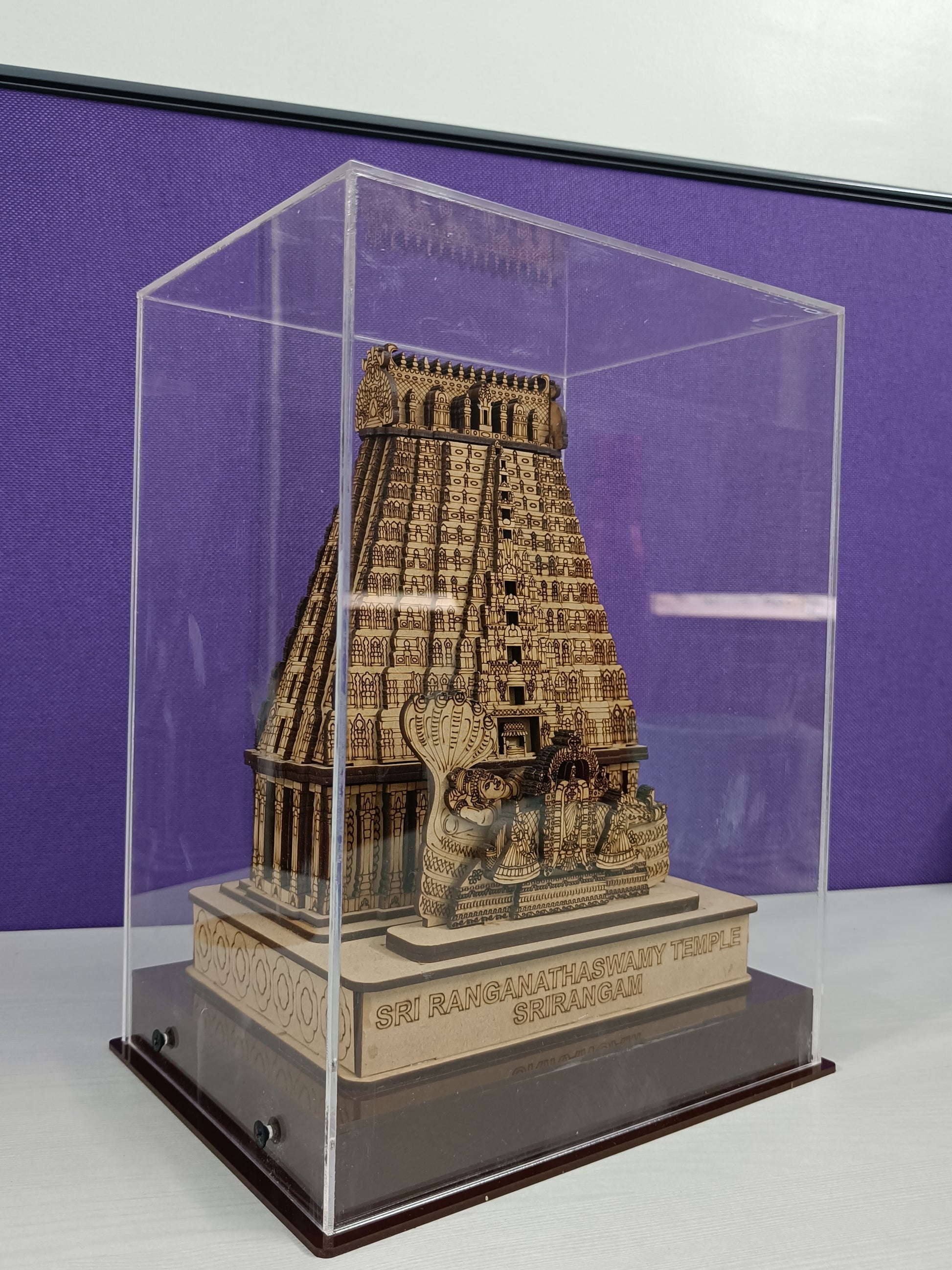 Sri Ranganathaswamy Temple in Srirangam, encased in an acrylic box. This beautifully detailed piece captures the grandeur of the temple's architecture, making it ideal for home decor or as a meaningful gift. The acrylic case enhances its durability and presentation, protecting the intricate wooden design while adding a contemporary touch. The base of the piece is engraved with the temple's name, further enhancing its spiritual and cultural significance. This replica is perfect for those who appreciate traditional craftsmanship and seek to bring a sense of serenity and devotion into their spaces.