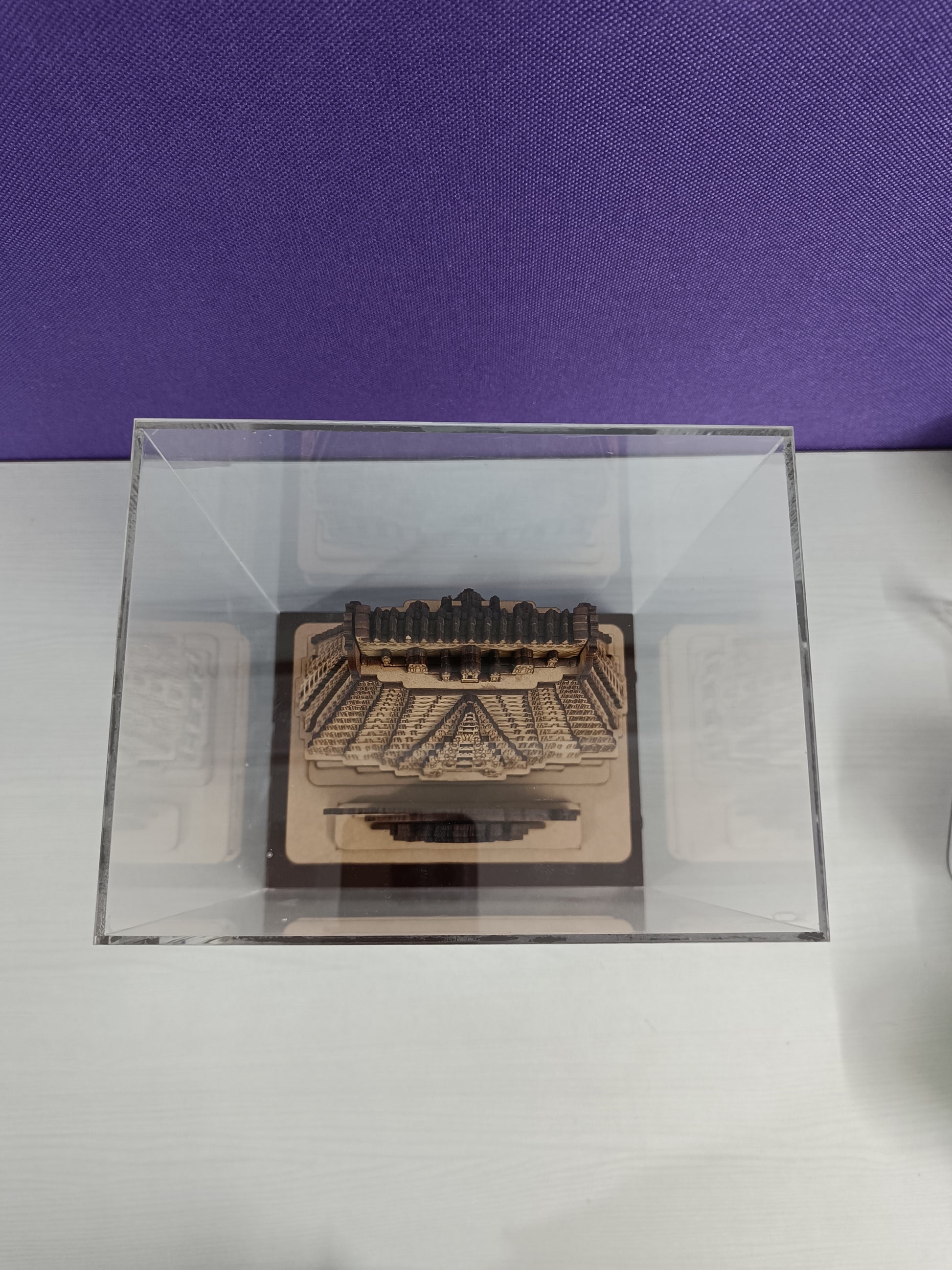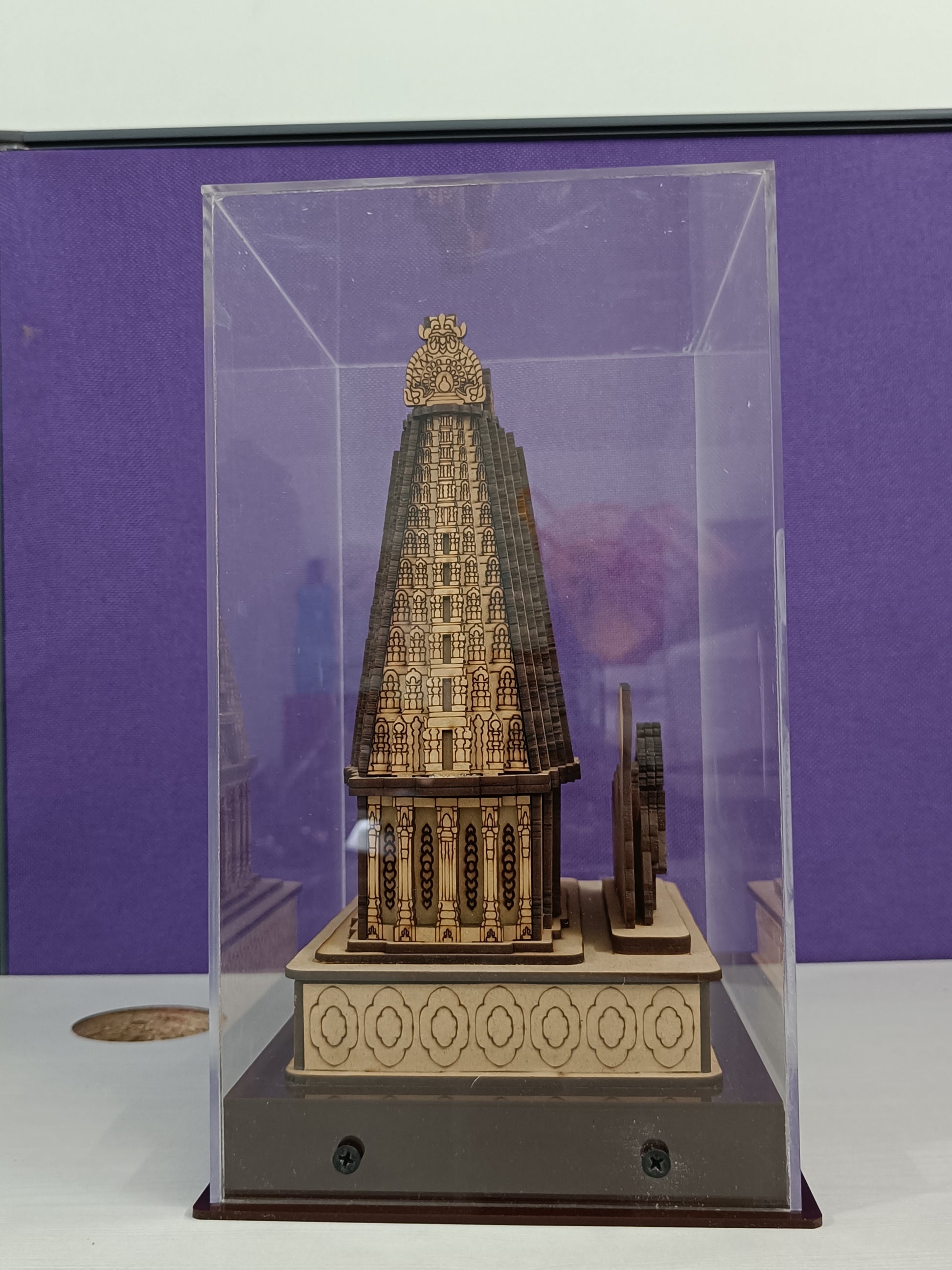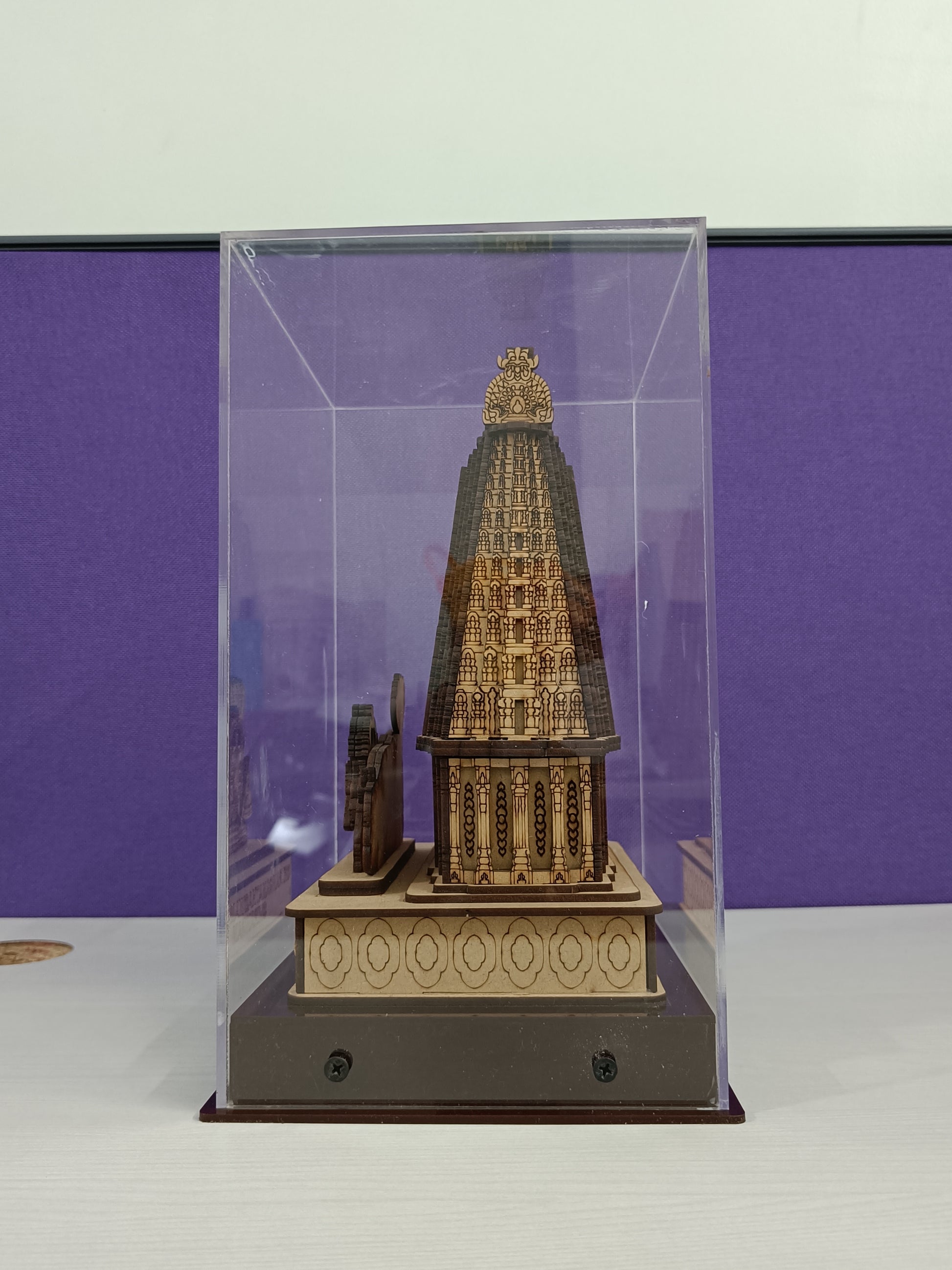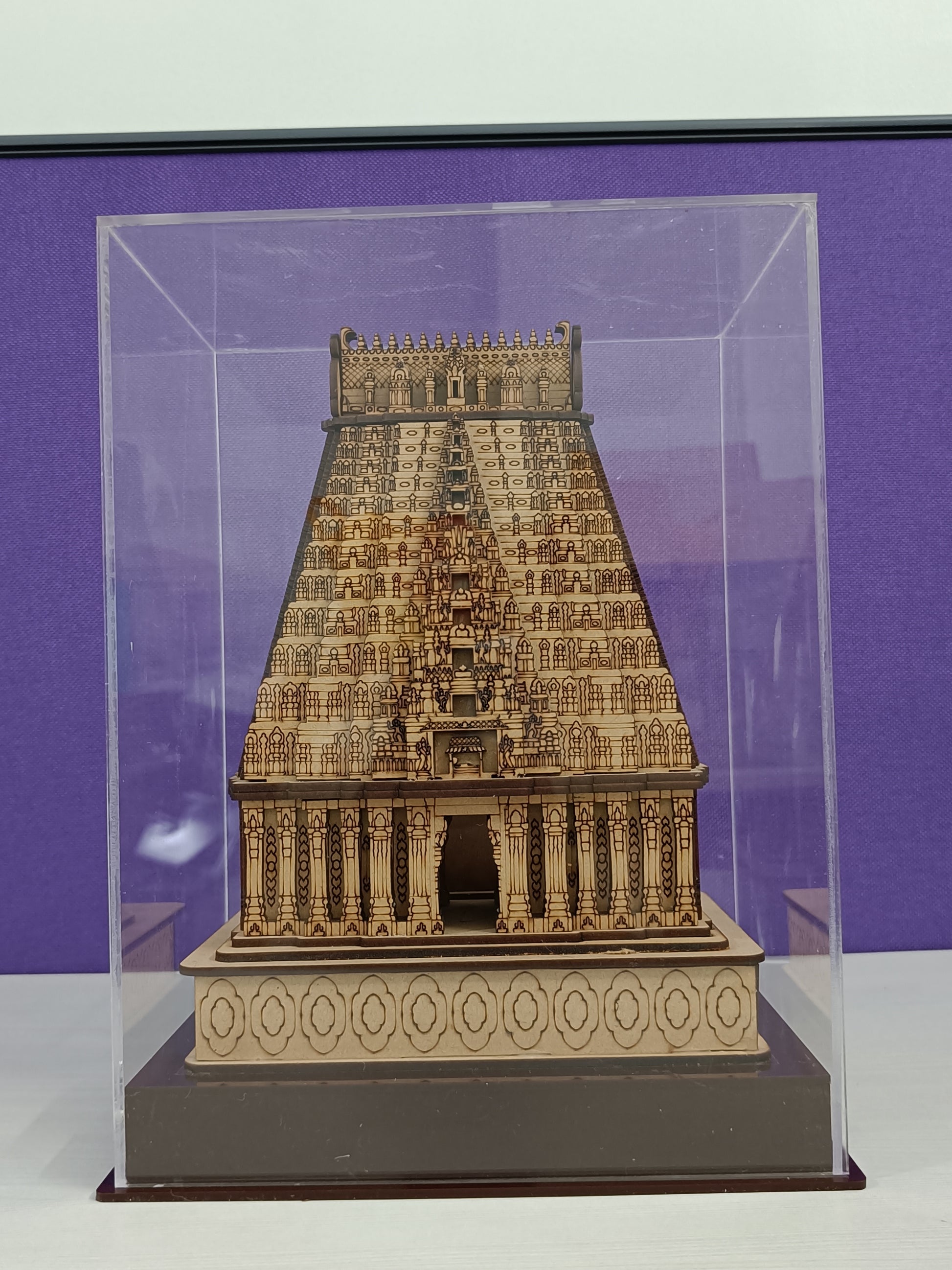 Sri Ranganathaswamy Temple in Srirangam, encased in an acrylic box. This beautifully detailed piece captures the grandeur of the temple's architecture, making it ideal for home decor or as a meaningful gift. The acrylic case enhances its durability and presentation, protecting the intricate wooden design while adding a contemporary touch. The base of the piece is engraved with the temple's name, further enhancing its spiritual and cultural significance. This replica is perfect for those who appreciate traditional craftsmanship and seek to bring a sense of serenity and devotion into their spaces.