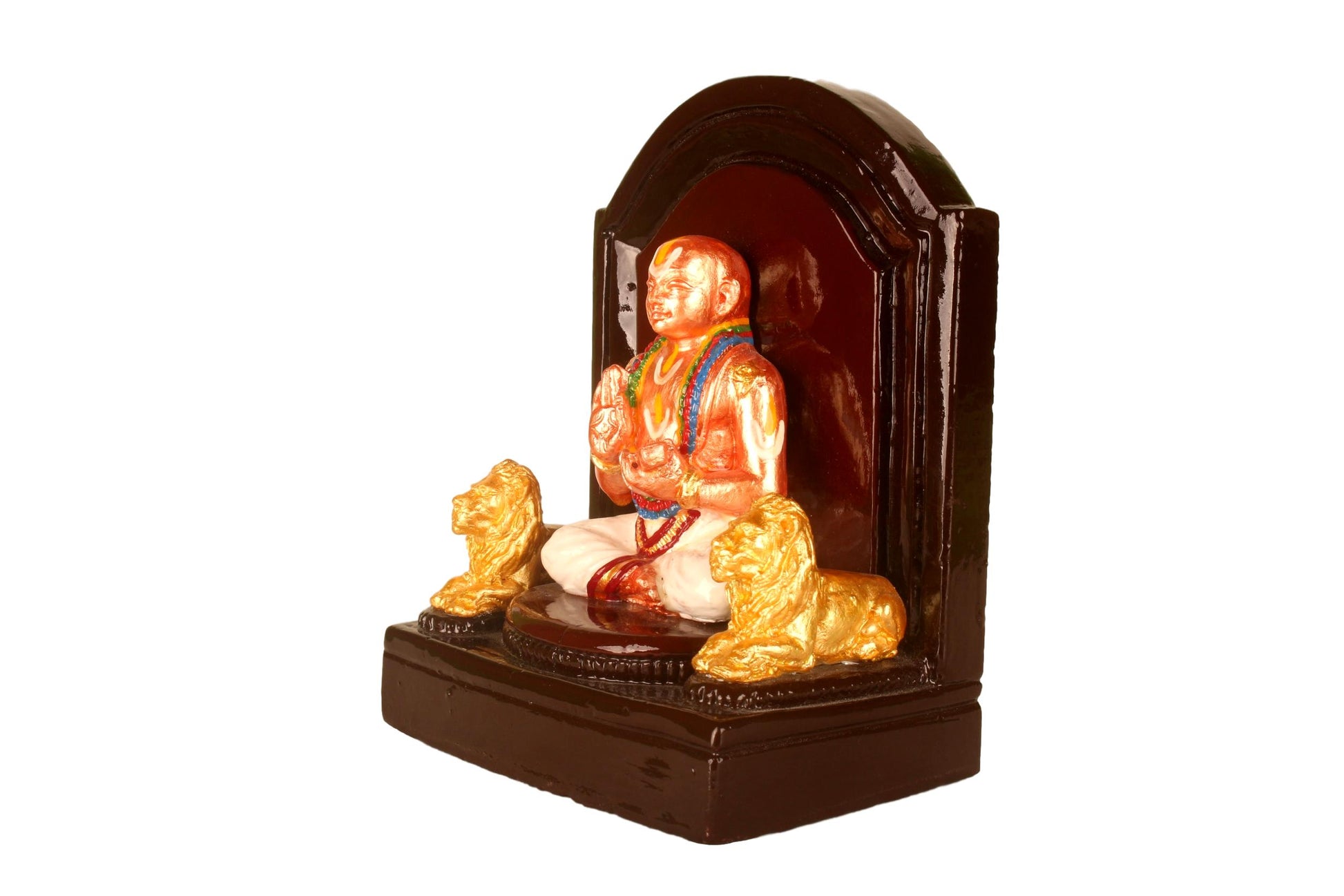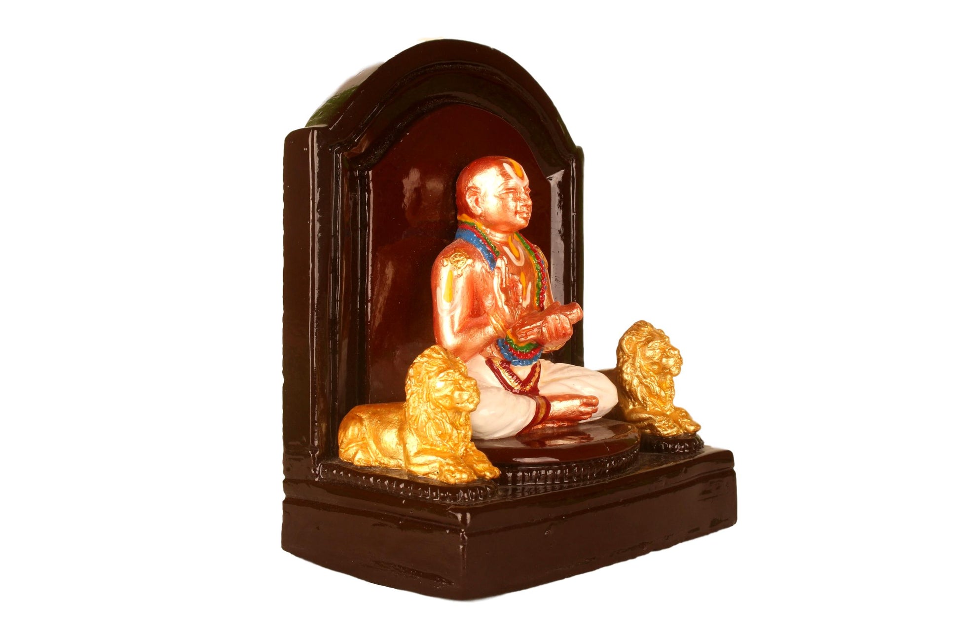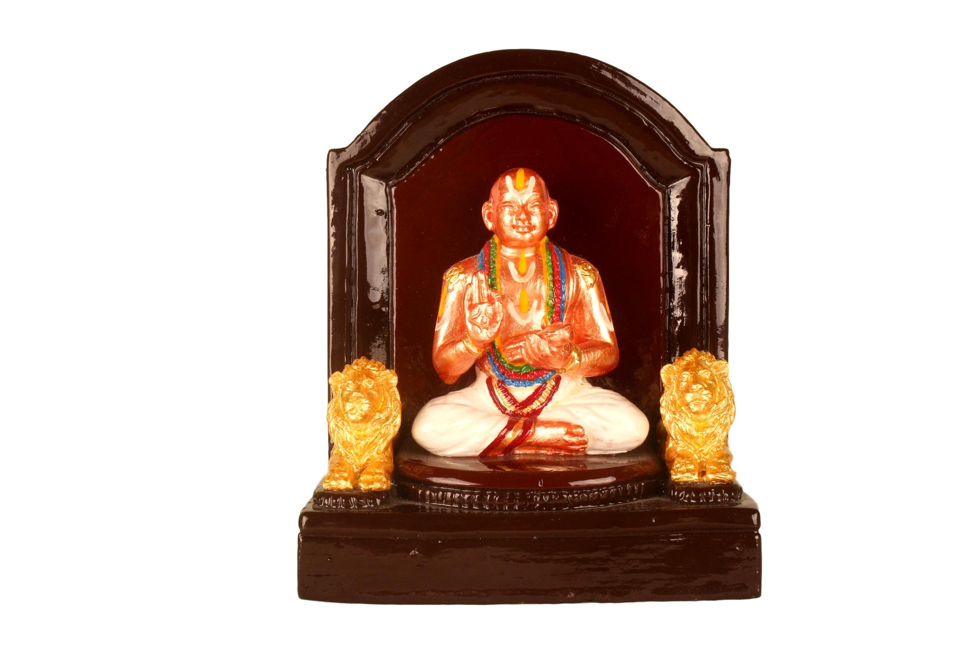 This finely crafted gypsum idol portrays Sri Vedanta Desikan in a majestic seated posture, flanked by two lions, symbolizing his unparalleled strength in knowledge and devotion. The idol captures the essence of the great acharya's spiritual wisdom and scholarly might. A perfect addition to your home altar, study space, or a meaningful gift for devotees and seekers of Vedantic knowledge.