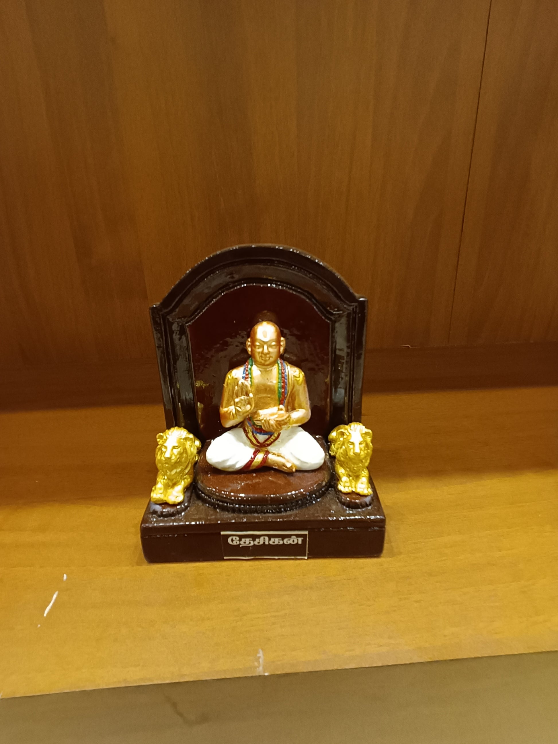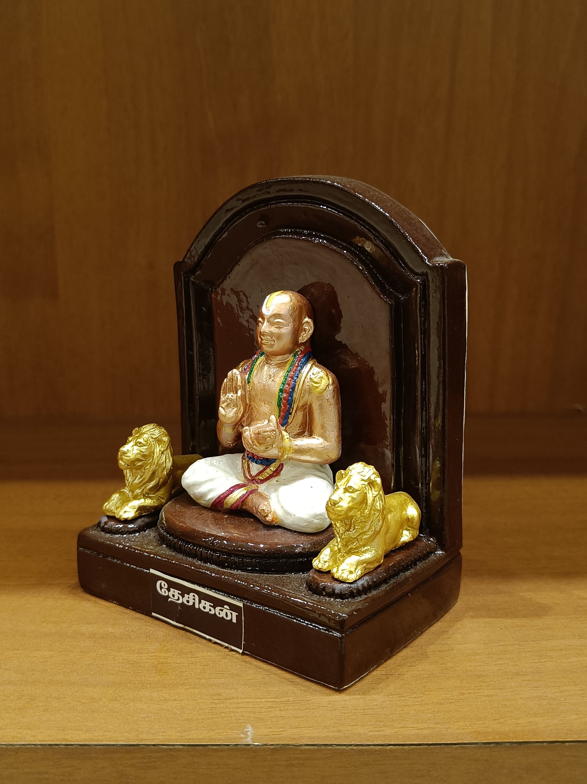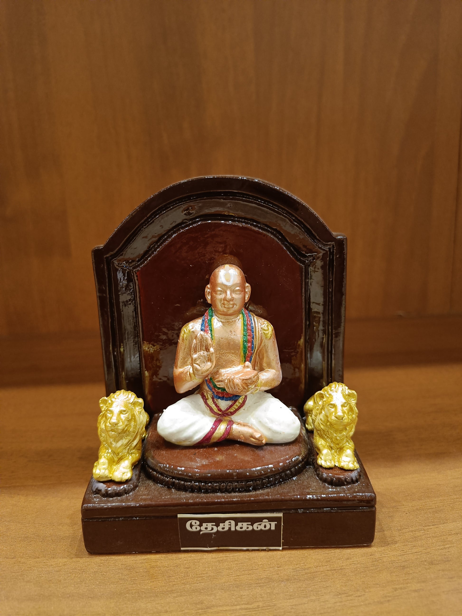 This finely crafted Swami Vedanta Desikan idol, made from durable fiber, depicts the revered Sri Vaishnava acharya in a seated posture, accompanied by two majestic lions on either side—symbolizing his mastery,logic, and divine protection. Compact and lightweight, this idol is perfect for home altars, spiritual gifts, or Acharya worship.