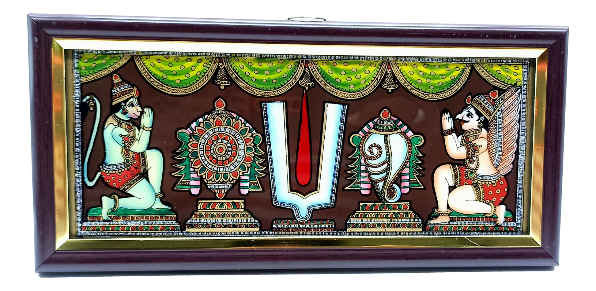 Adorn your walls with the divine beauty of the Tiruman Sangu Chakram Hanuman Garudan Wall Hanging Tanjore Glass Artwork. This masterpiece combines intricate Tanjore artistry with the shimmering allure of glasswork. The depiction of Lord Hanuman and Garuda, the celestial carrier, exudes strength, devotion, and protection.