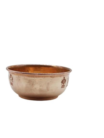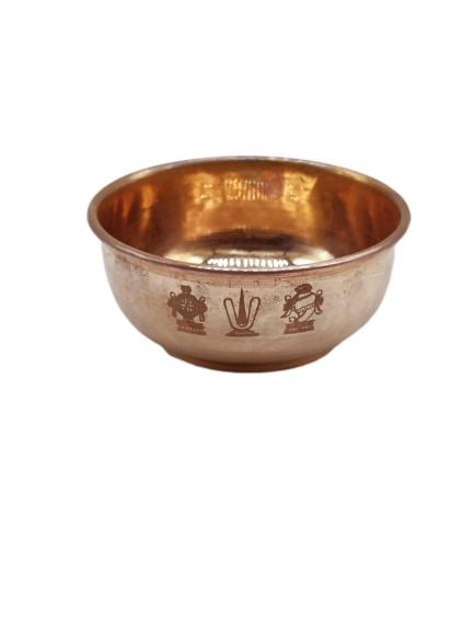 This Copper Bowl is a sacred and versatile accessory for Tiruvarathanam and pooja ceremonies. Crafted from high-quality copper, it features intricate engravings of Tiruman, Sangu, and Chakram, representing auspicious symbols in Hinduism. The bowl's design is ideal for holding sacred water, offering ablutions during worship rituals, and conducting Tiruvarathanam (ritual bathing) of deities. Its durable construction and smooth finish make it easy to clean and maintain. The engravings add a touch of traditional charm and spirituality to the bowl, enhancing the sanctity of worship. Whether used for daily pooja rituals or special occasions, this Copper Bowl is a cherished item for devotees and a symbol of devotion and reverence.