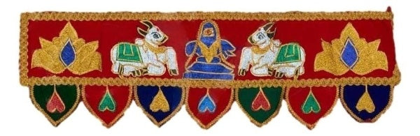 The velvet cloth material Vasal Thoranam depicting Lord Shiva's Lingam with Nandi is a sacred and ornate piece of art. Crafted from high-quality velvet material, this Thoranam showcases intricate designs and vibrant colors, creating a visually captivating display. The depiction of Lord Shiva's Lingam, symbolizing cosmic energy and creation, along with Nandi, the divine bull and devotee of Shiva, adds a sense of devotion and spirituality to the artwork. Whether used as a decorative accent for festivals or as a sacred adornment for home altars, this Vasal Thoranam exudes an aura of reverence, auspiciousness, and divine blessings.