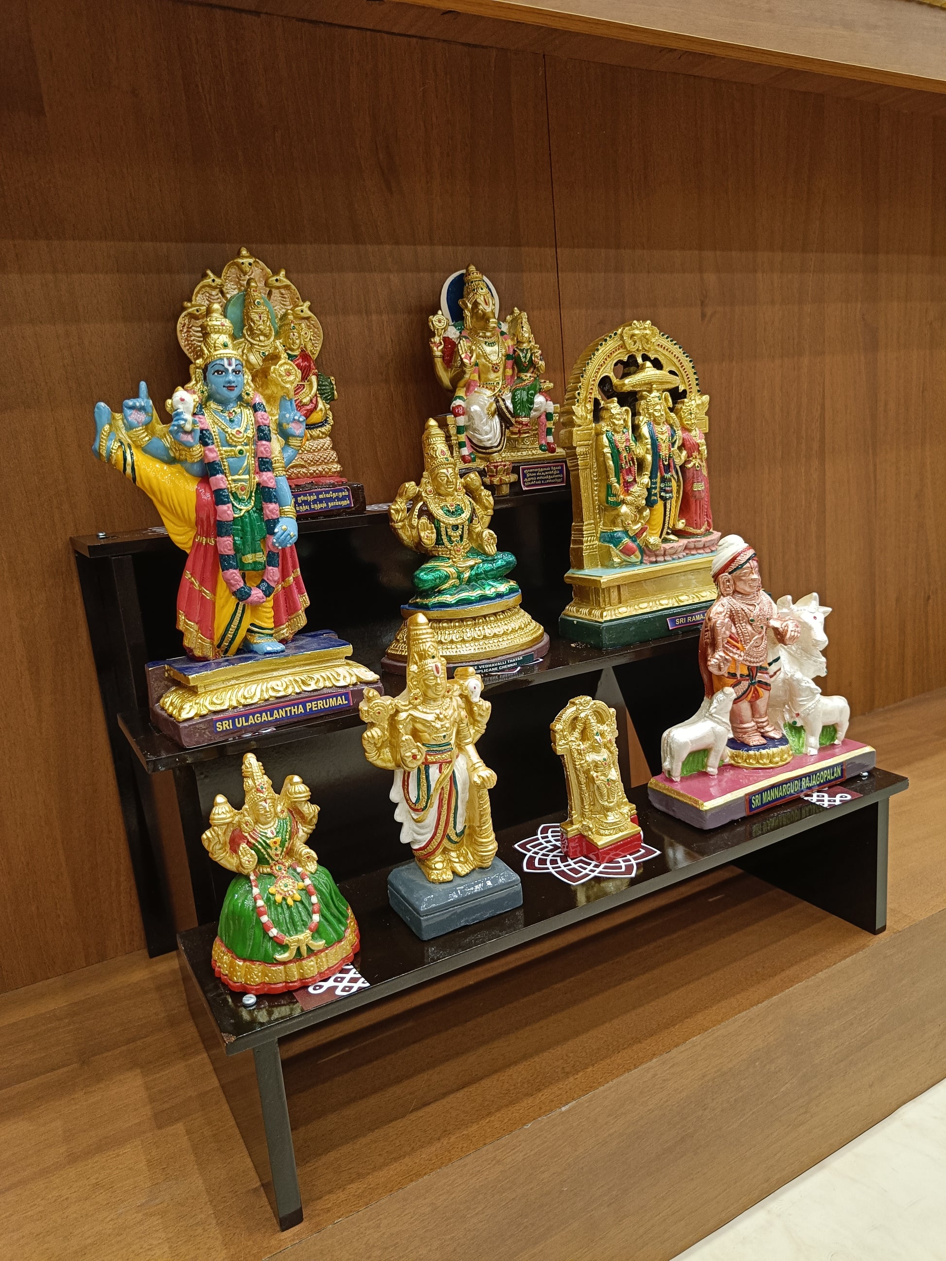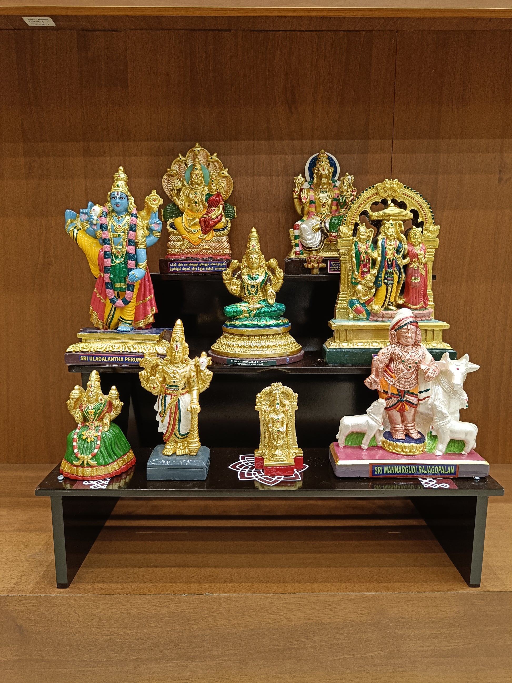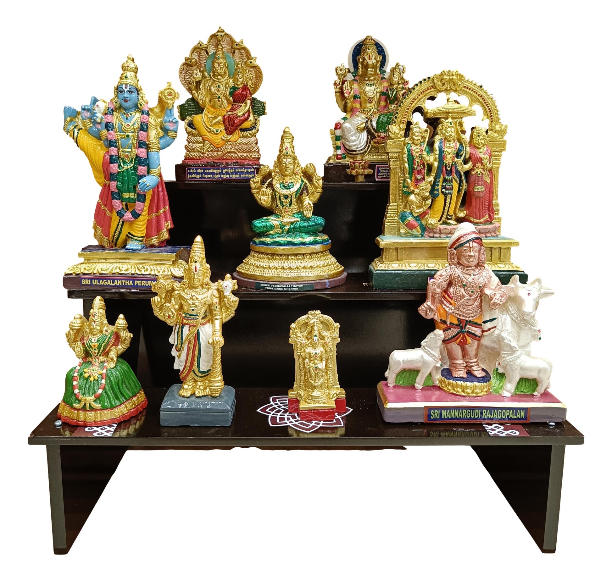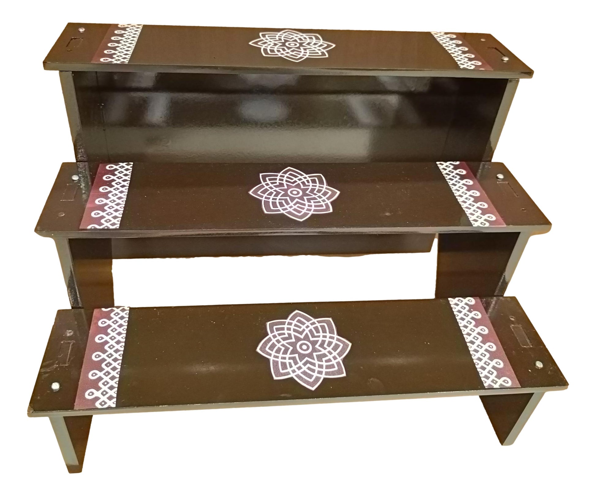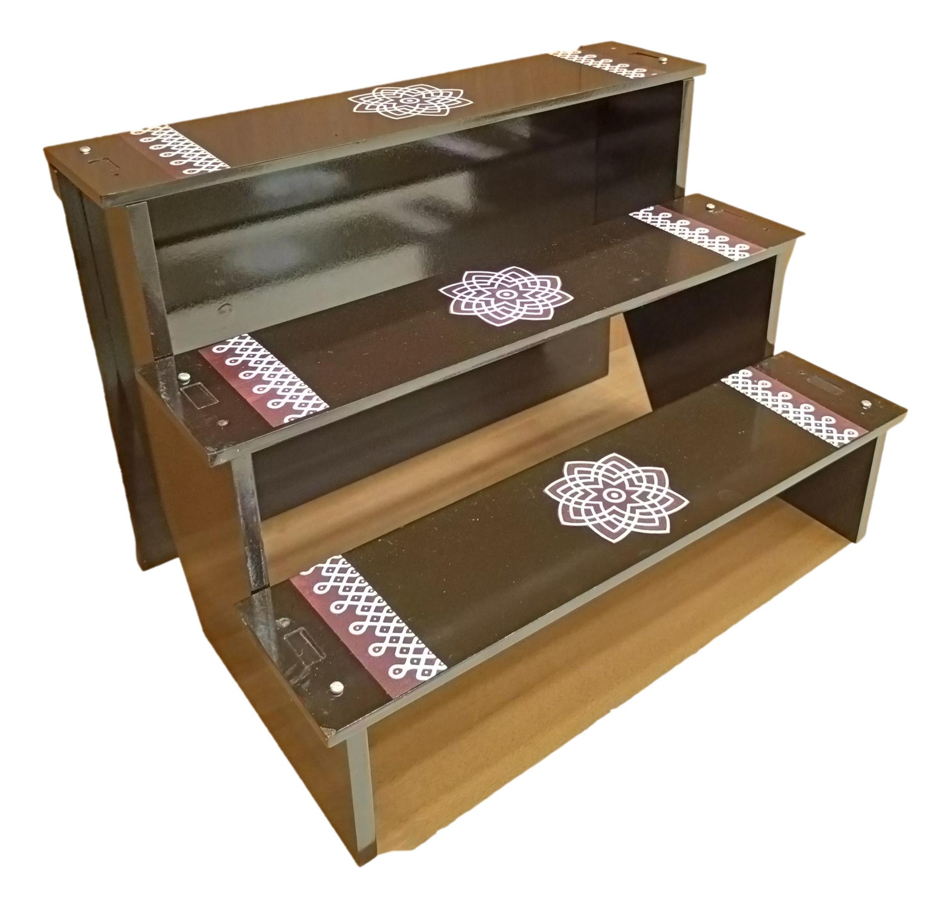 Beautiful and practical wooden 3-step deity stand, designed to be easily dismantled for convenient storage and transport. Perfect for displaying idols, photo frames, or festive decor during Navaratri (Golu) and other celebrations. A thoughtful and reusable spiritual gift for any home.