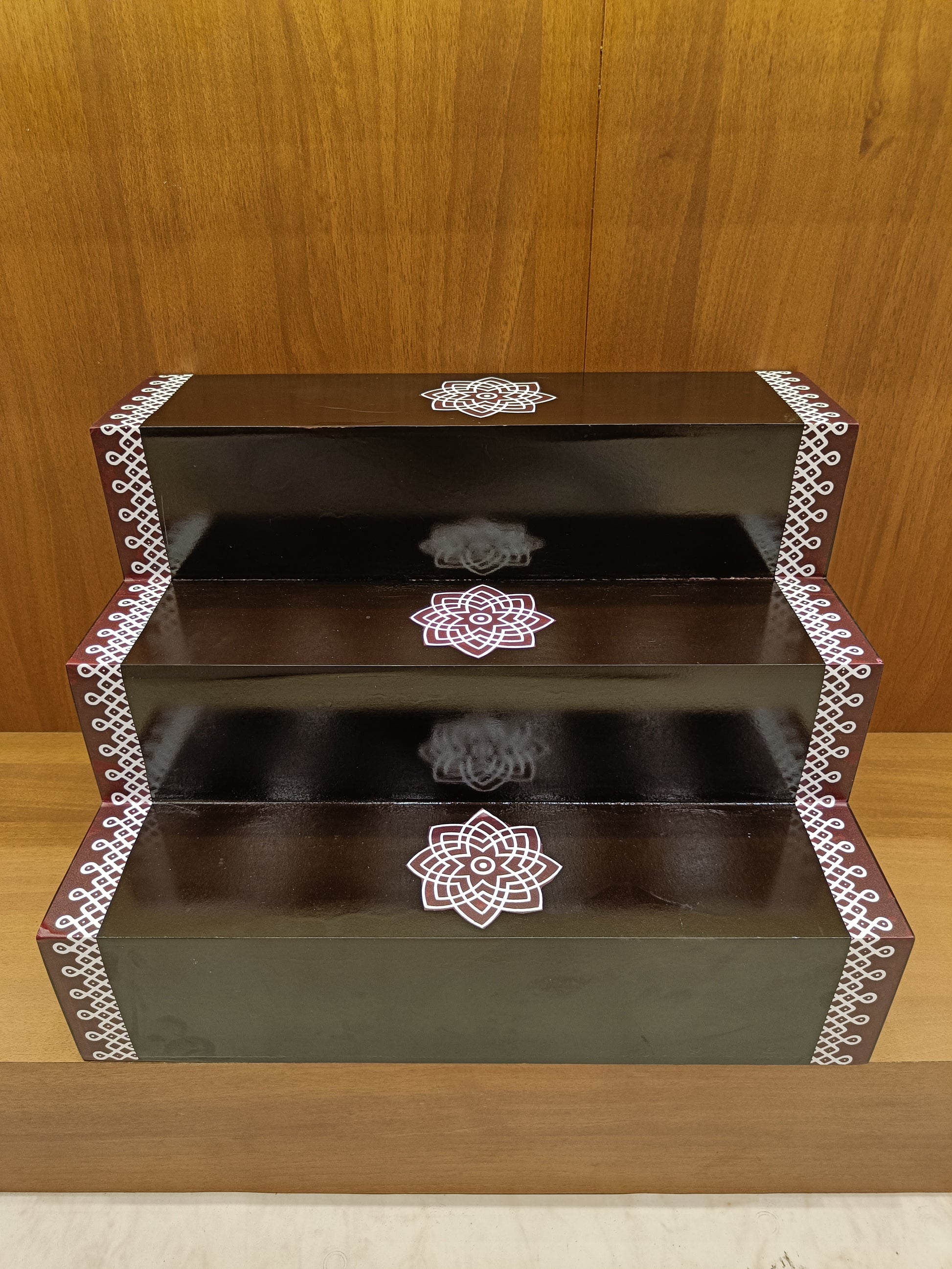 Beautifully handcrafted wooden 3-step deity stand designed without gaps, featuring intricate Rangoli patterns for a festive and traditional look. Perfect for displaying idols, frames, or decor items during festivals like Navaratri (Golu) or as a charming gift for spiritual occasions.