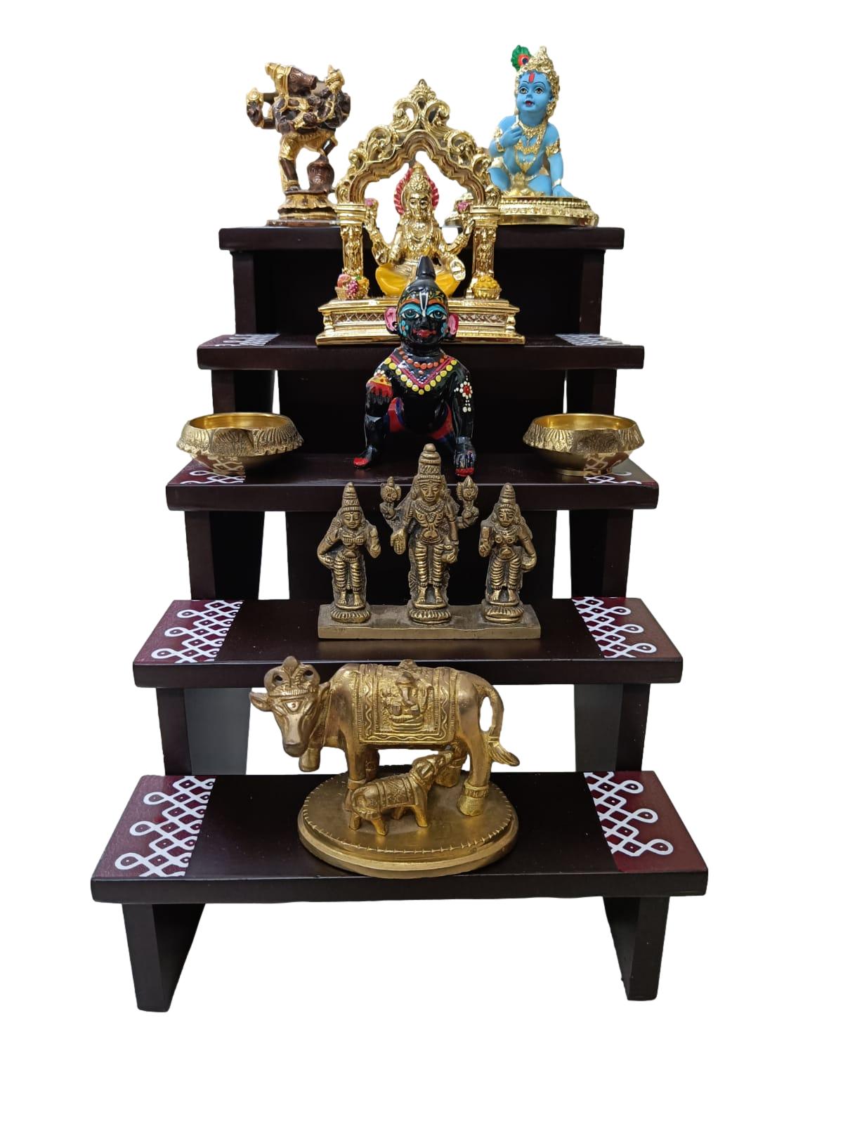 The Wooden 5 Step and 5 Lamp Stand is an exquisite piece designed for both decorative and religious purposes. Crafted from premium wood, it features five graduated steps, perfect for displaying deities, statues, or cherished items, alongside five built-in lamp holders for traditional oil lamps or candles. Each step is carefully finished to highlight the wood's natural beauty, ensuring durability and aesthetic appeal. Ideal for home altars, temples, or festive occasions, this stand combines functionality with spirituality, creating a warm and inviting ambiance. Its elegant design and practical use make it a versatile and cherished addition to any sacred or celebratory space.