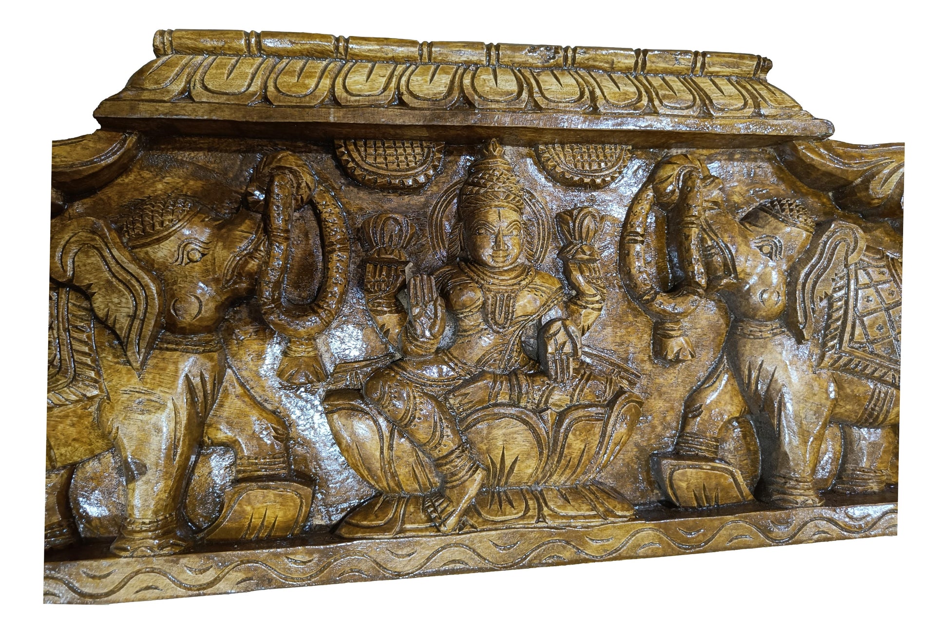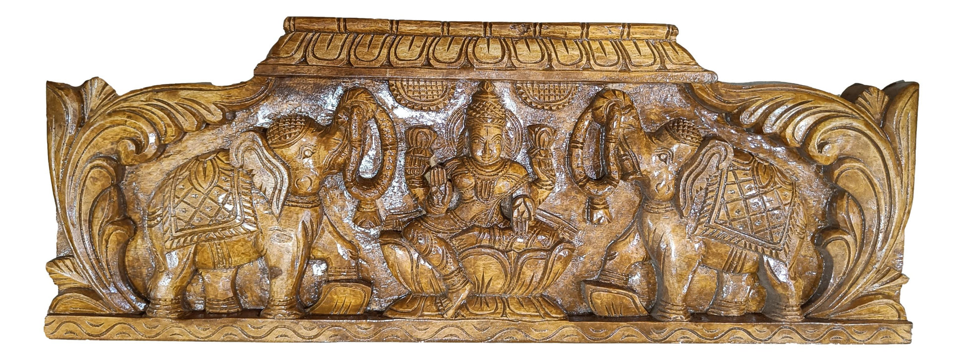 This intricately hand-carved wooden wall hanging features Goddess Gajalakshmi, the goddess of wealth, prosperity, and abundance, seated gracefully on a lotus. She is flanked by two majestic elephants, each holding floral garlands in their trunks, symbolizing auspicious blessings and divine grace.
