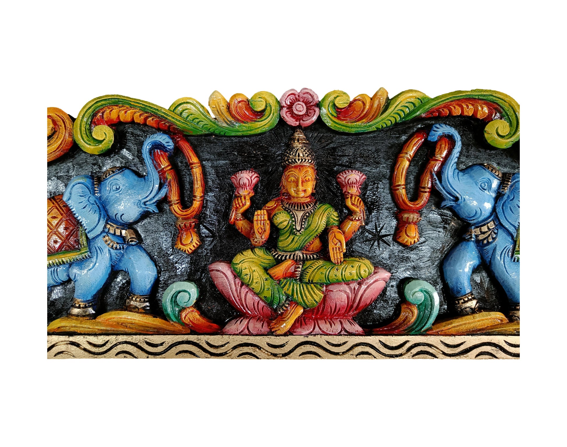 Wooden Gajalakshmi Wall Panel – Handcrafted Lakshmi on Lotus with Elephants and Floral Arch Décor