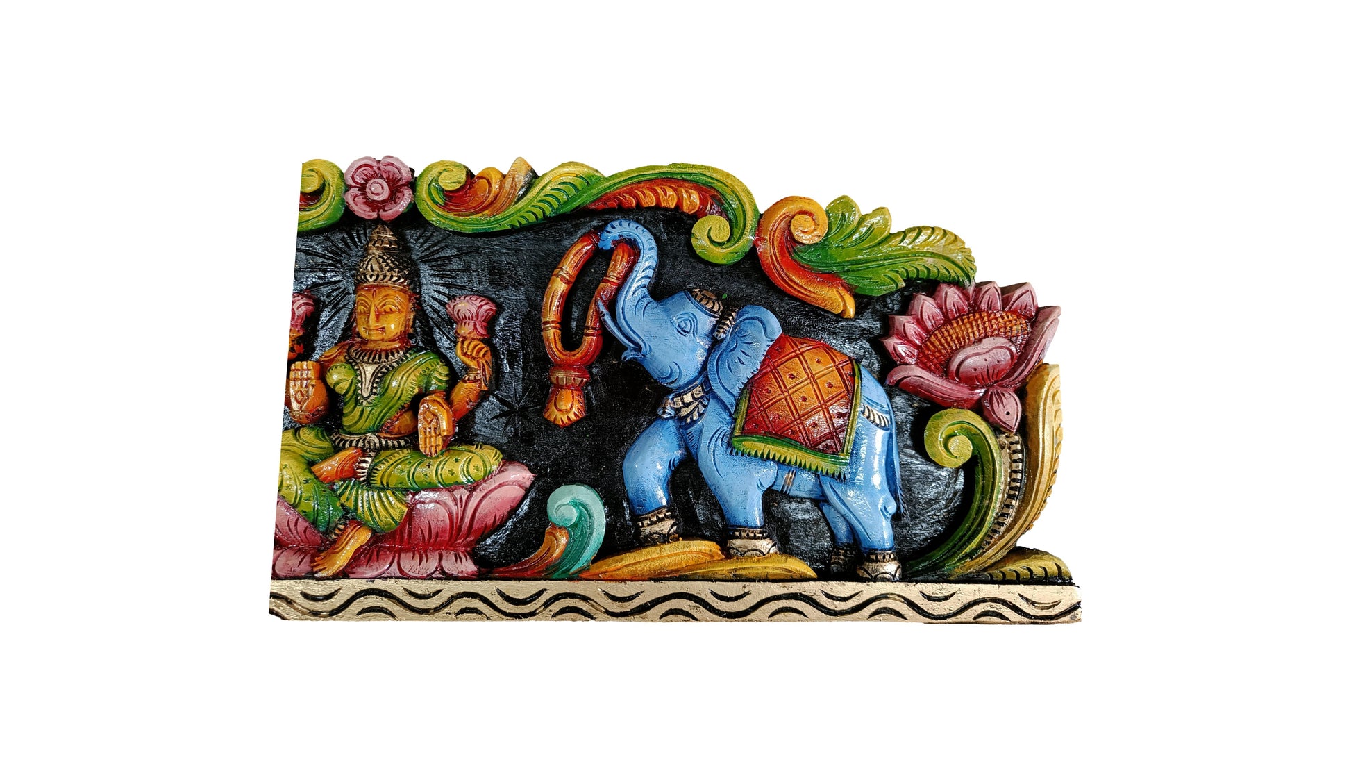 This beautifully handcrafted wooden Gajalakshmi wall panel features Goddess Lakshmi seated gracefully on a lotus, flanked by majestic elephants symbolizing abundance and auspiciousness. The panel is intricately carved from jackfruit wood, known for its durability and rich texture, and is adorned with a delicate floral arch that enhances its traditional charm.