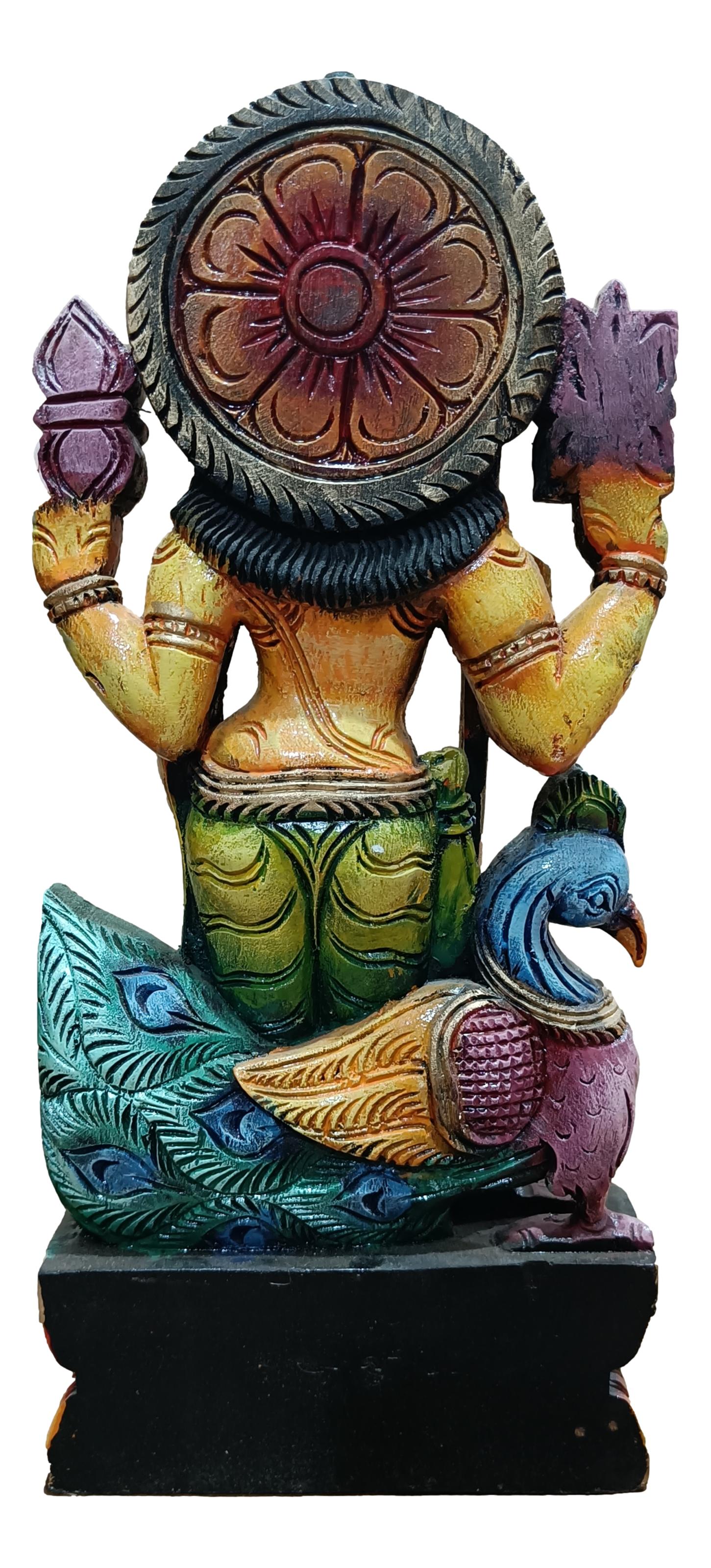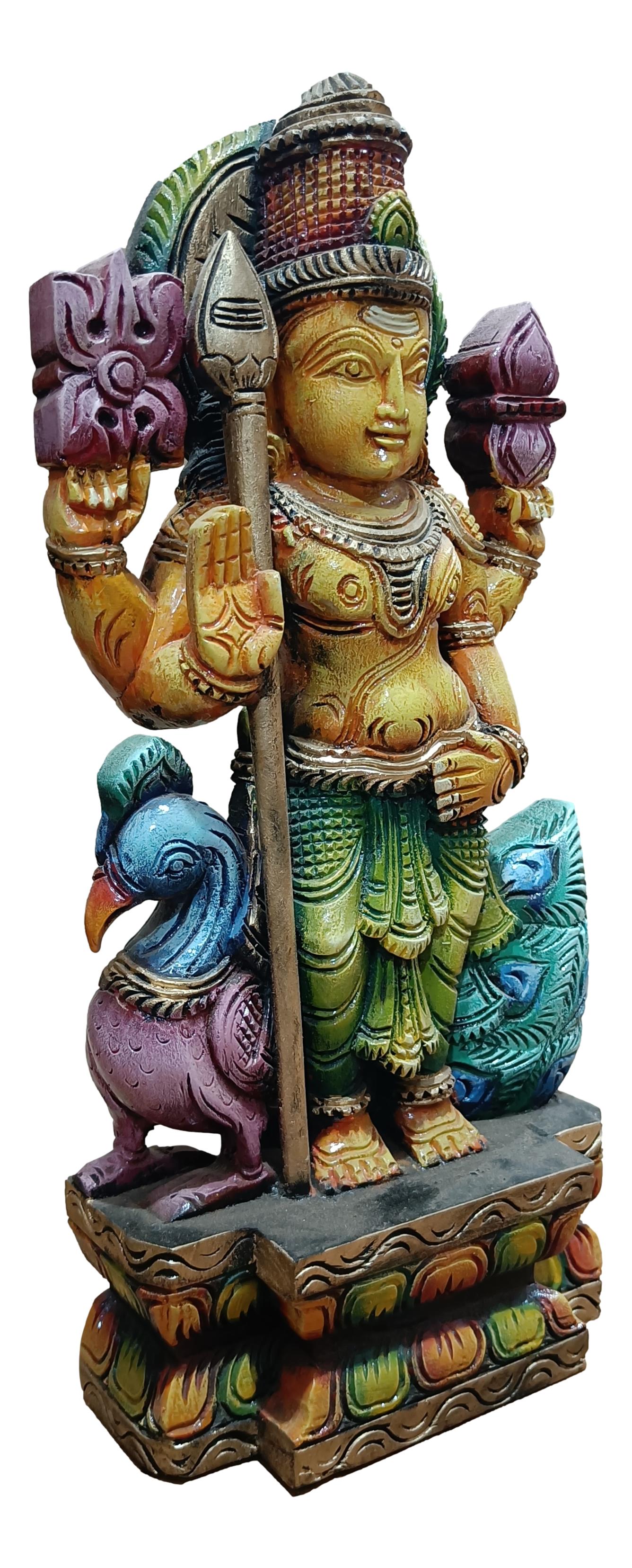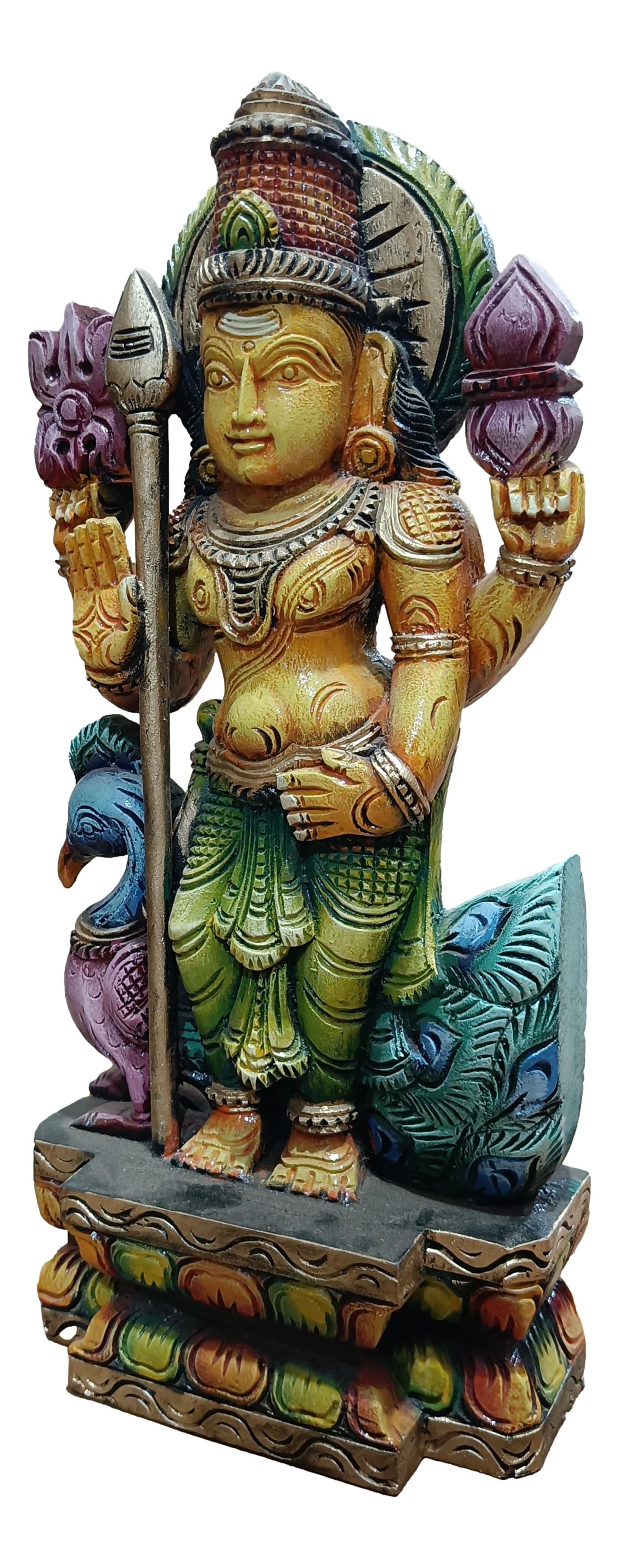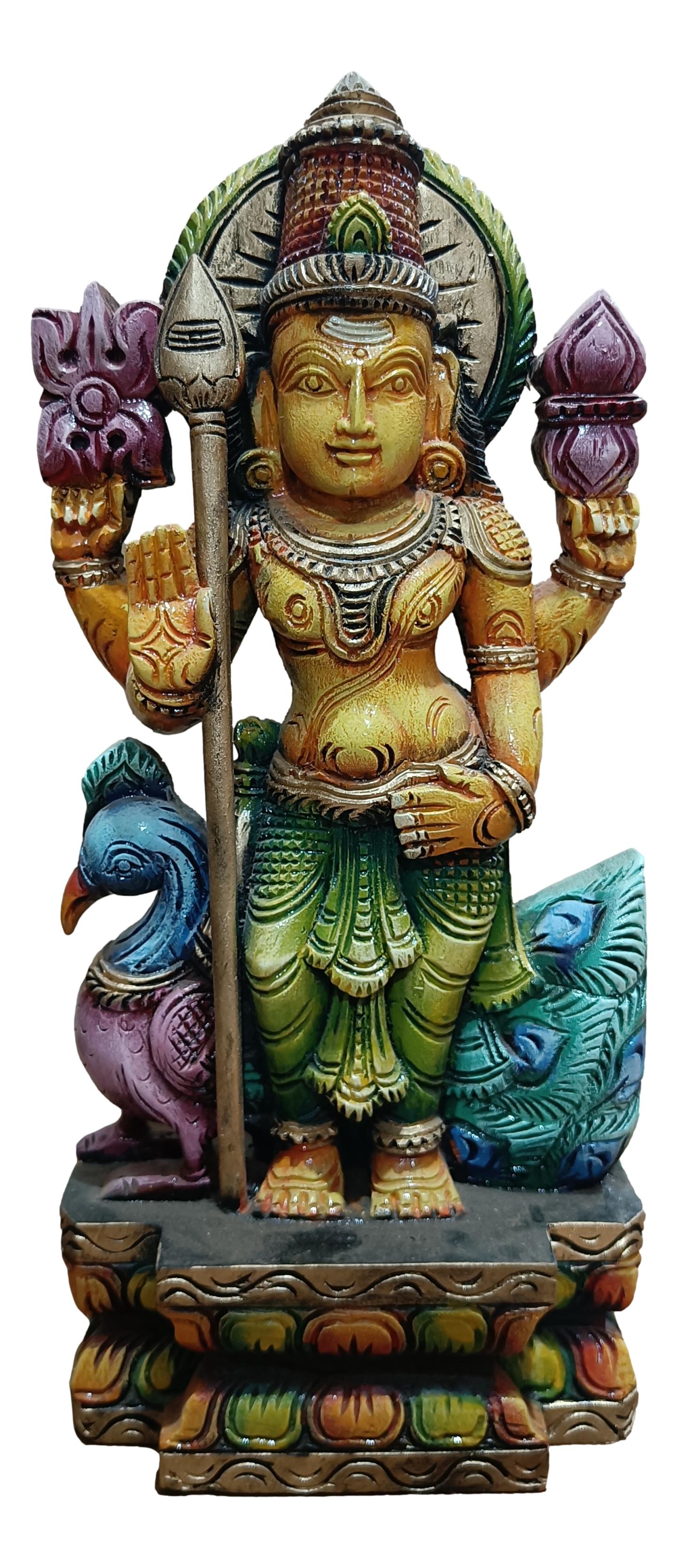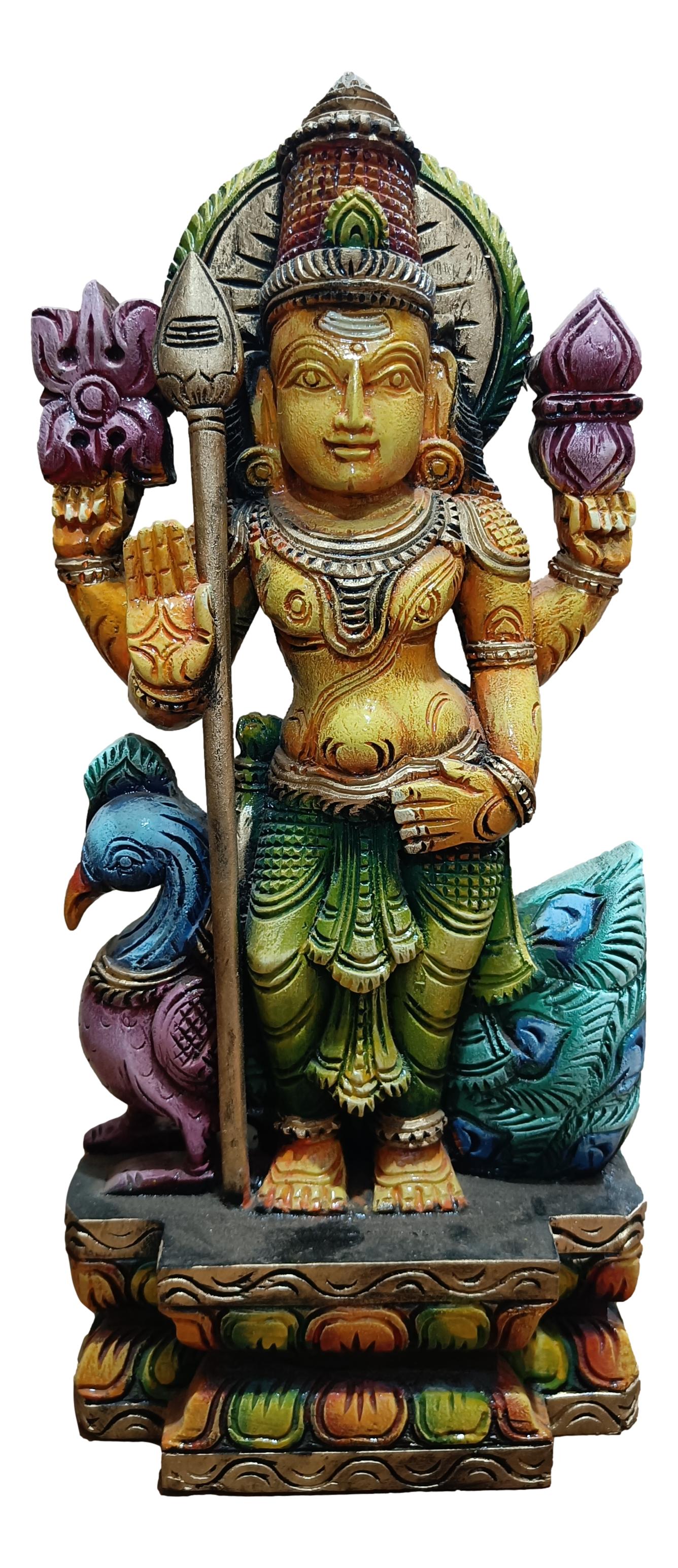 This divine Lord Murugar (Kartikeya/Subramanya) idol, meticulously carved from premium quality wood and hand-painted in vibrant traditional colors, embodies grace, valor, and spiritual beauty. Standing at 18 inches, this idol is ideal for home altars, spiritual gifting, or sacred decor.