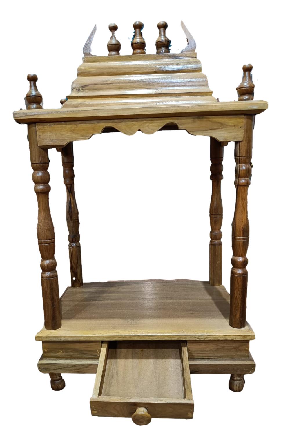 A jackfruit wood pooja mandapam, a beautifully crafted structure for performing Hindu rituals. This mandapam features a detailed design with turned pillars and a stepped roof. The natural grain and hue of the jackfruit wood add to its aesthetic appeal. It includes a drawer at the bottom, providing convenient storage for ritual items. The overall design is both functional and decorative, making it a significant piece for any sacred space.