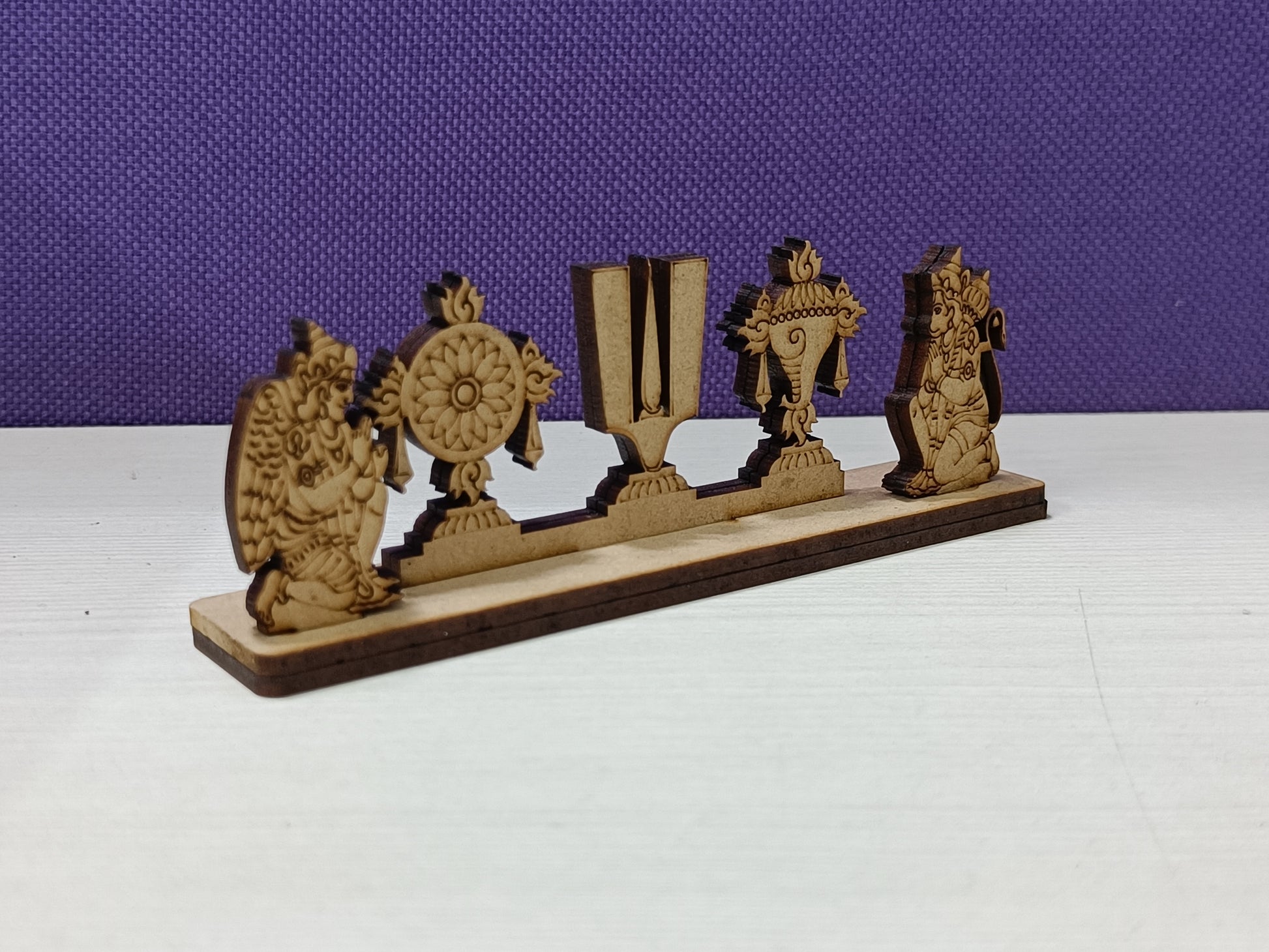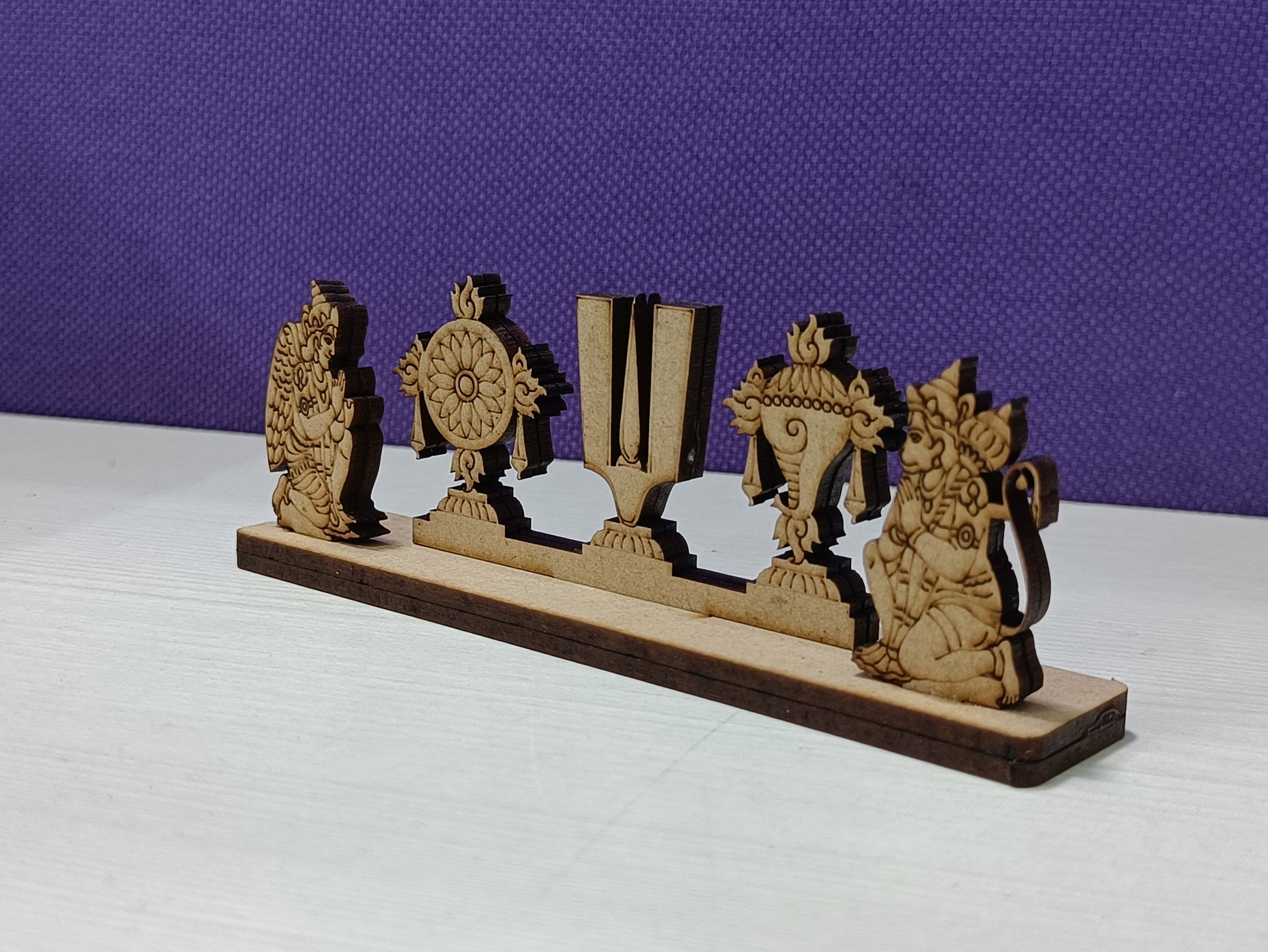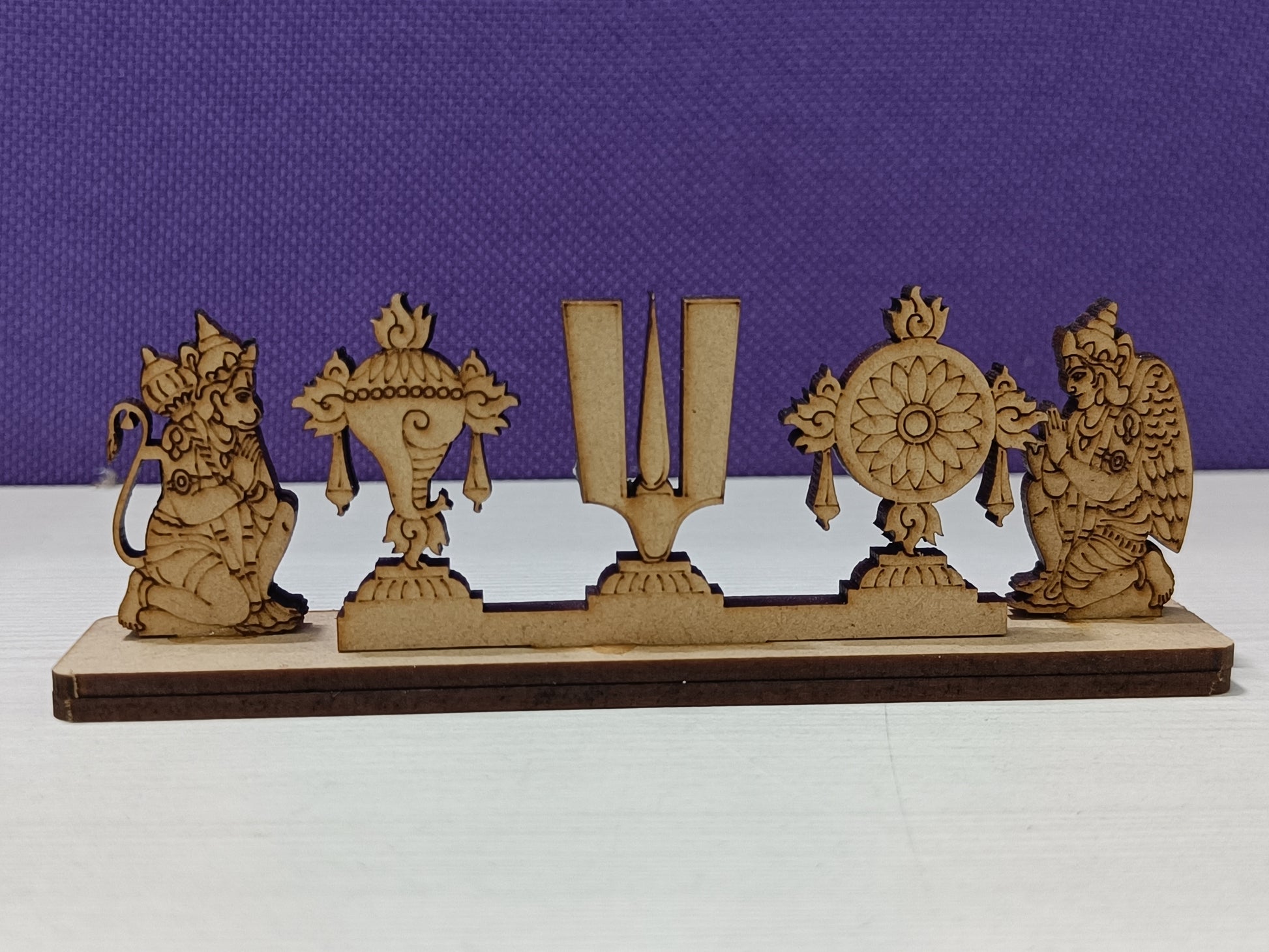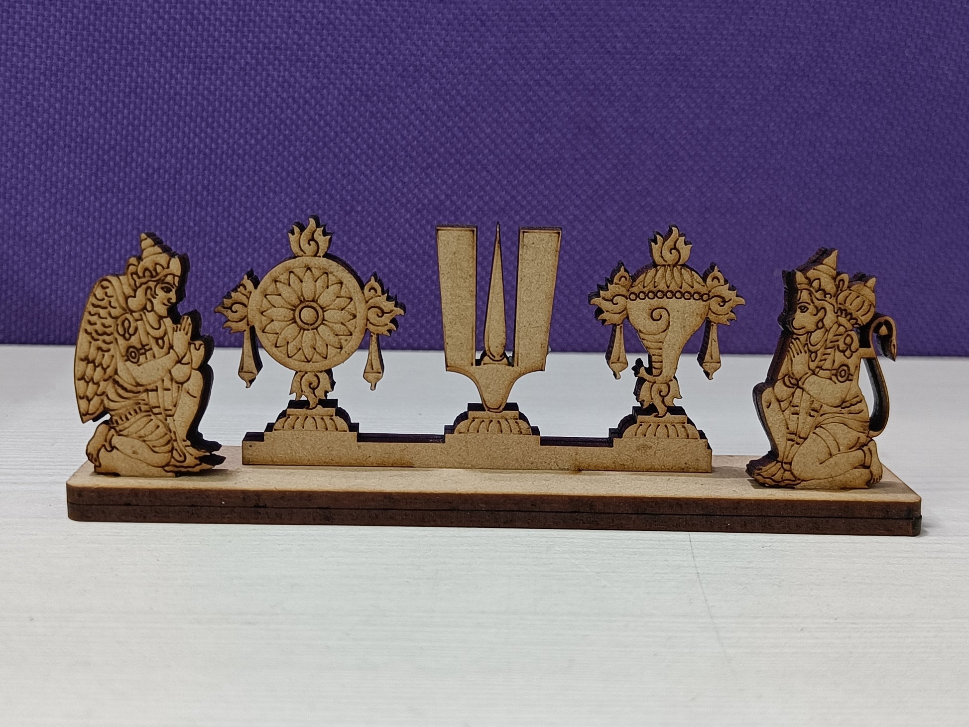 Exquisitely crafted wooden Thenkalai Tiruman featuring the sacred Chakram and Sangu, flanked by Garudan and Hanuman in a bending posture with folded hands. A symbol of Sri Vaishnava tradition, devotion, and divine protection. Ideal for car dashboards, home altars, or as a thoughtful spiritual gift.