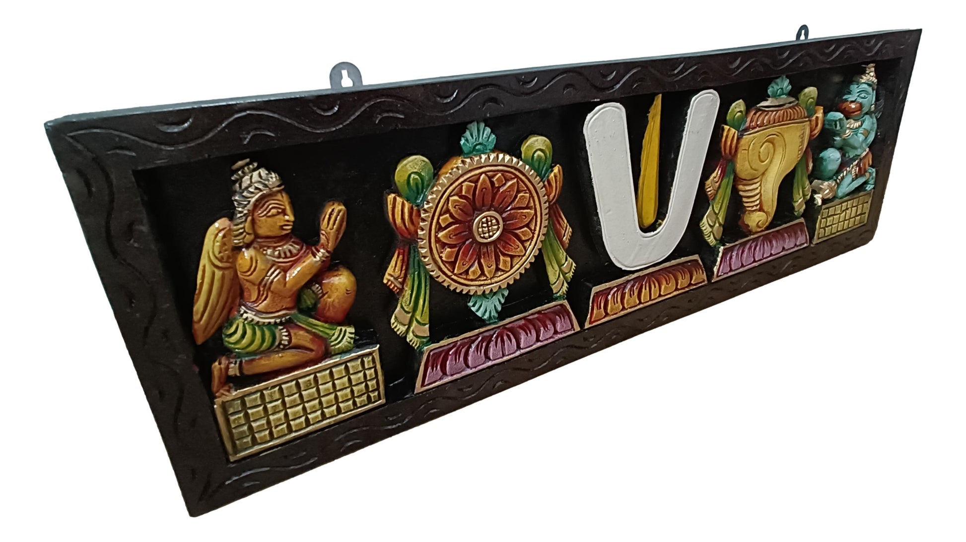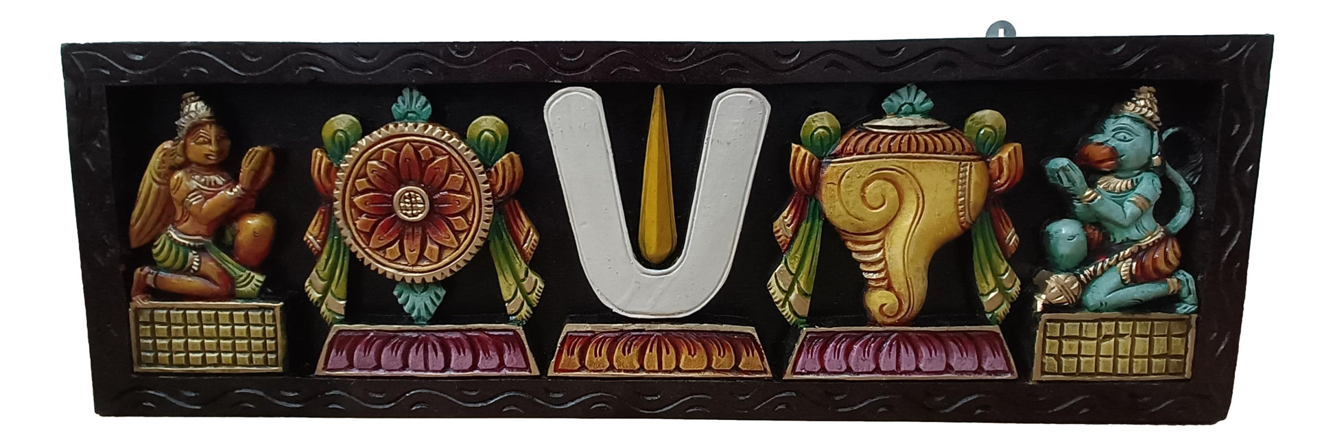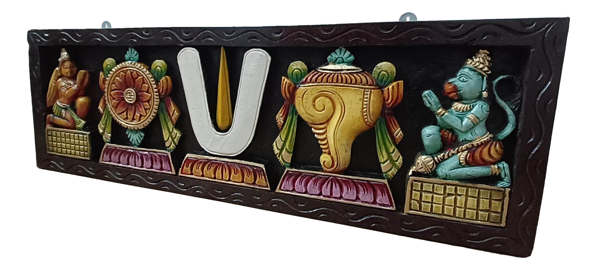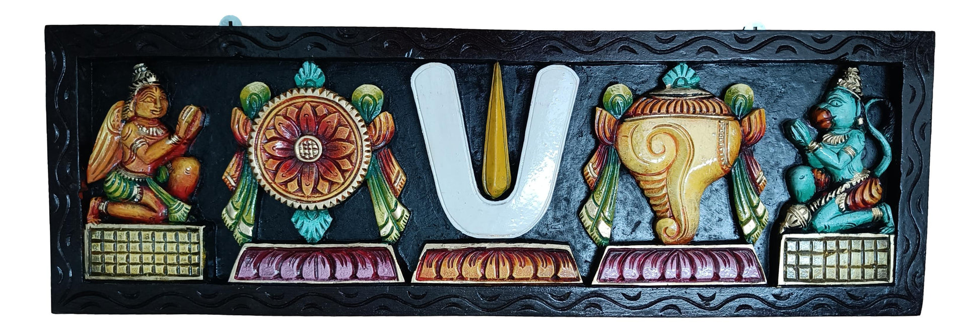 The Jackfruit Wood Multi-Colour Vadakalai Tiruman Sangu Chakaram and Garudan Hanuman Wall Hanging is a captivating fusion of spirituality and artistic craftsmanship. Crafted from durable jackfruit wood, this wall hanging features the sacred Vadakalai Tiruman symbol, Sangu (conch), Chakram (discus), Garudan (eagle), and Hanuman, each intricately carved with exquisite detail.