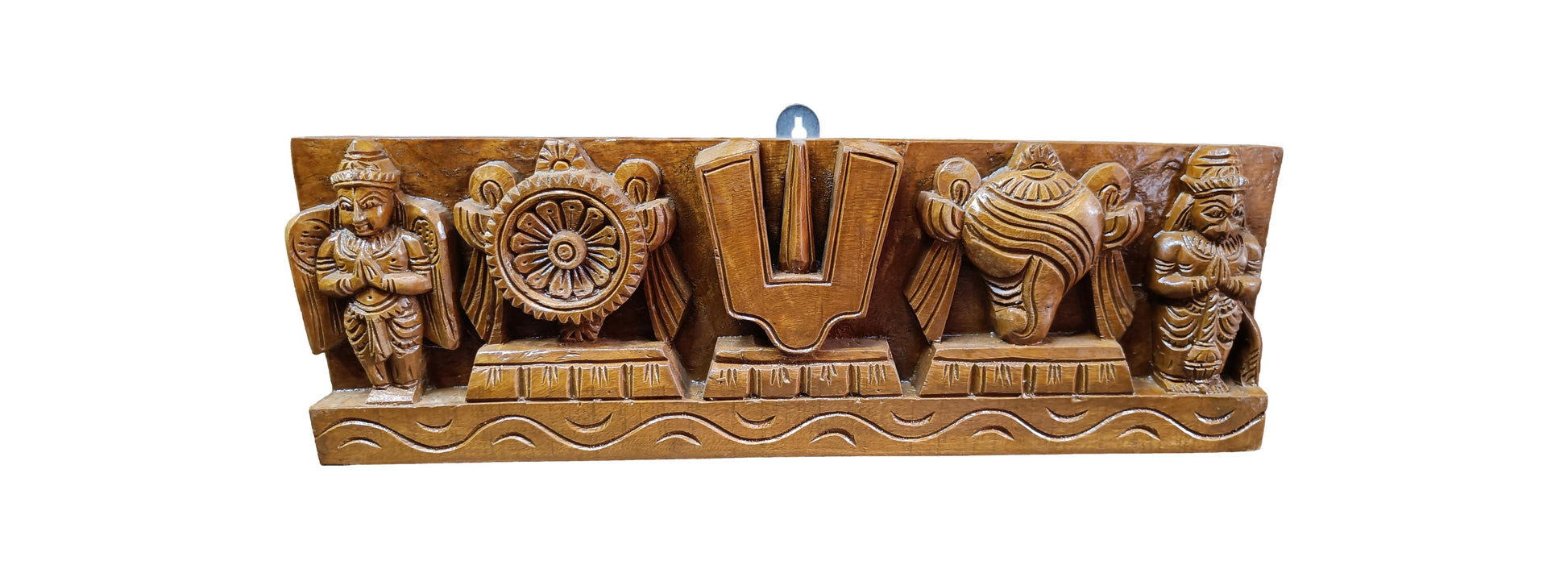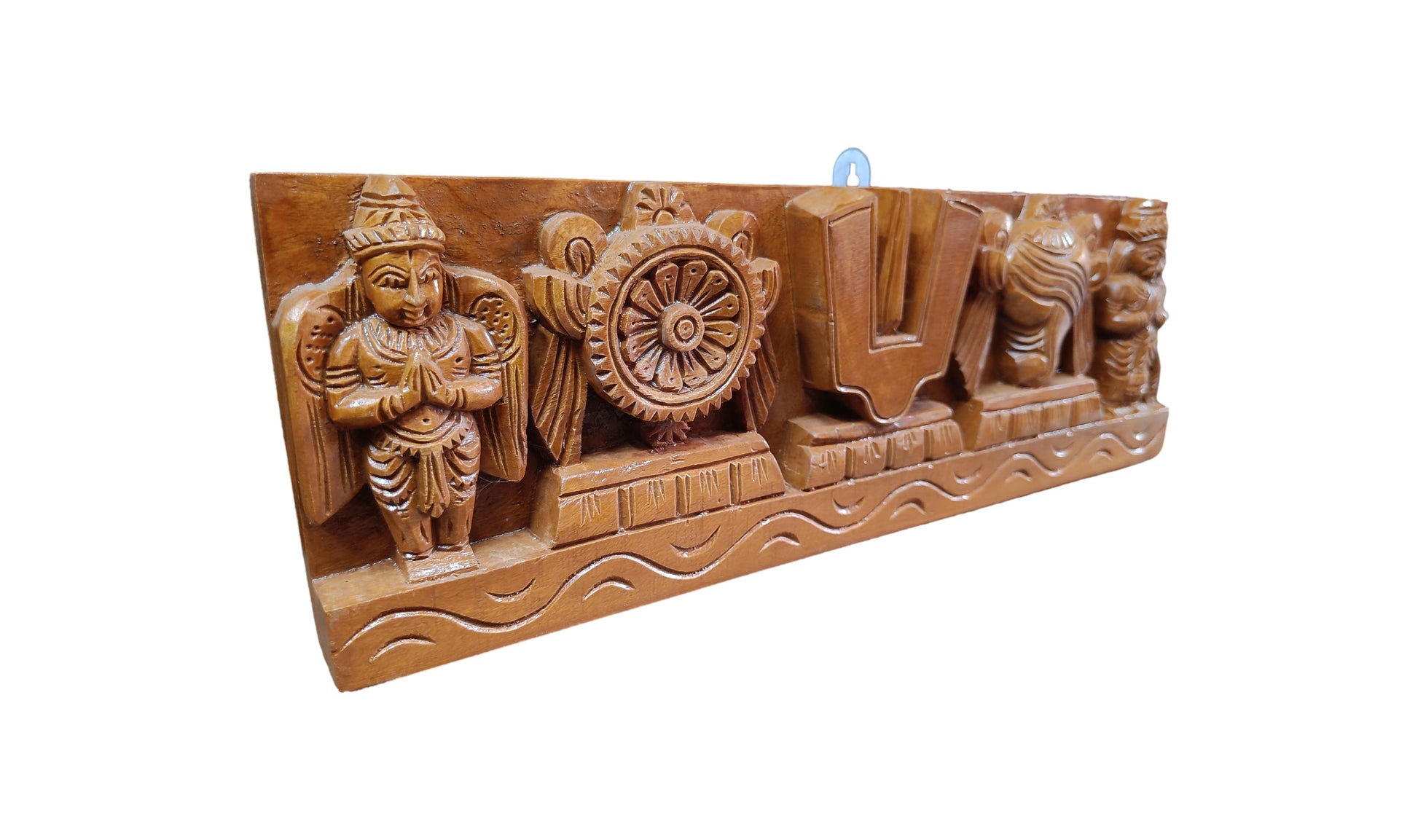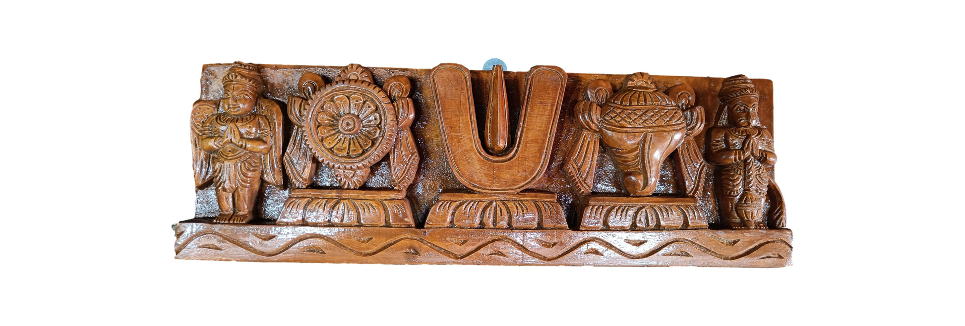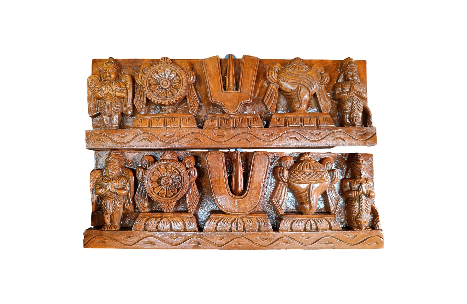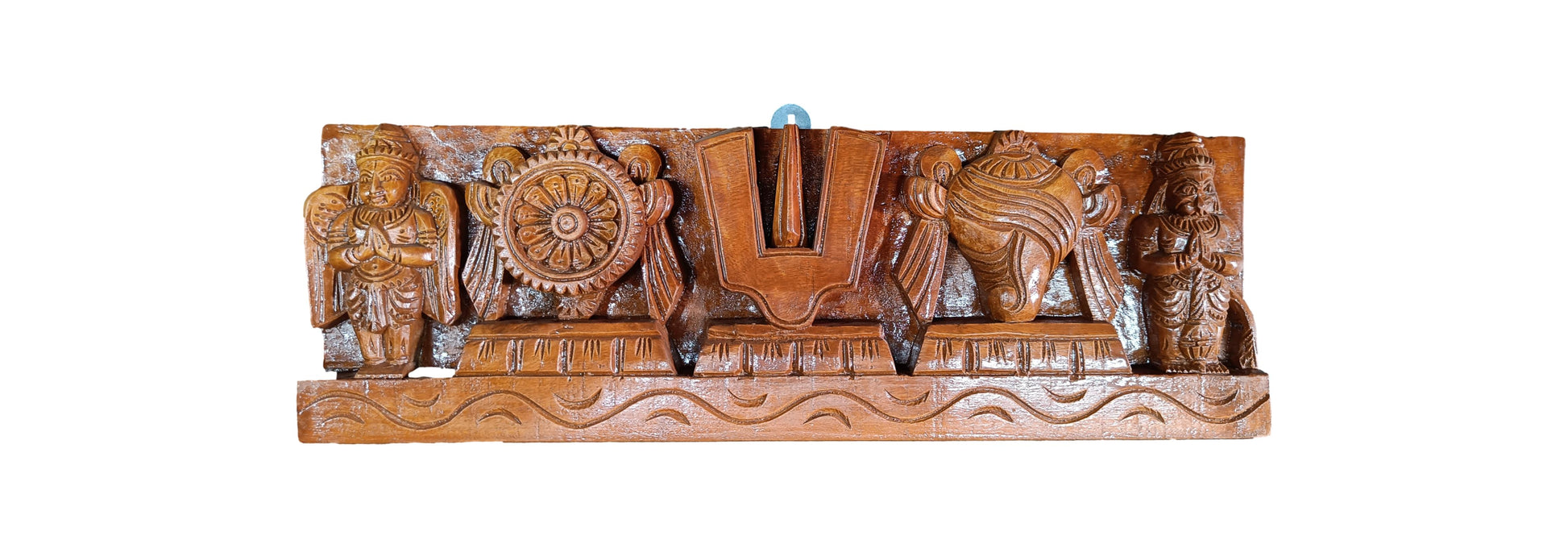 Bring a divine touch to your home with this beautifully handcrafted Tiruman Sangu Chakra wooden wall hanging, made from high-quality jackfruit wood. Symbolizing the presence of Lord Vishnu, the Tiruman (sacred forehead mark) is flanked by the Shanku (conch) and Chakra (discus)—icons of protection and dharma.