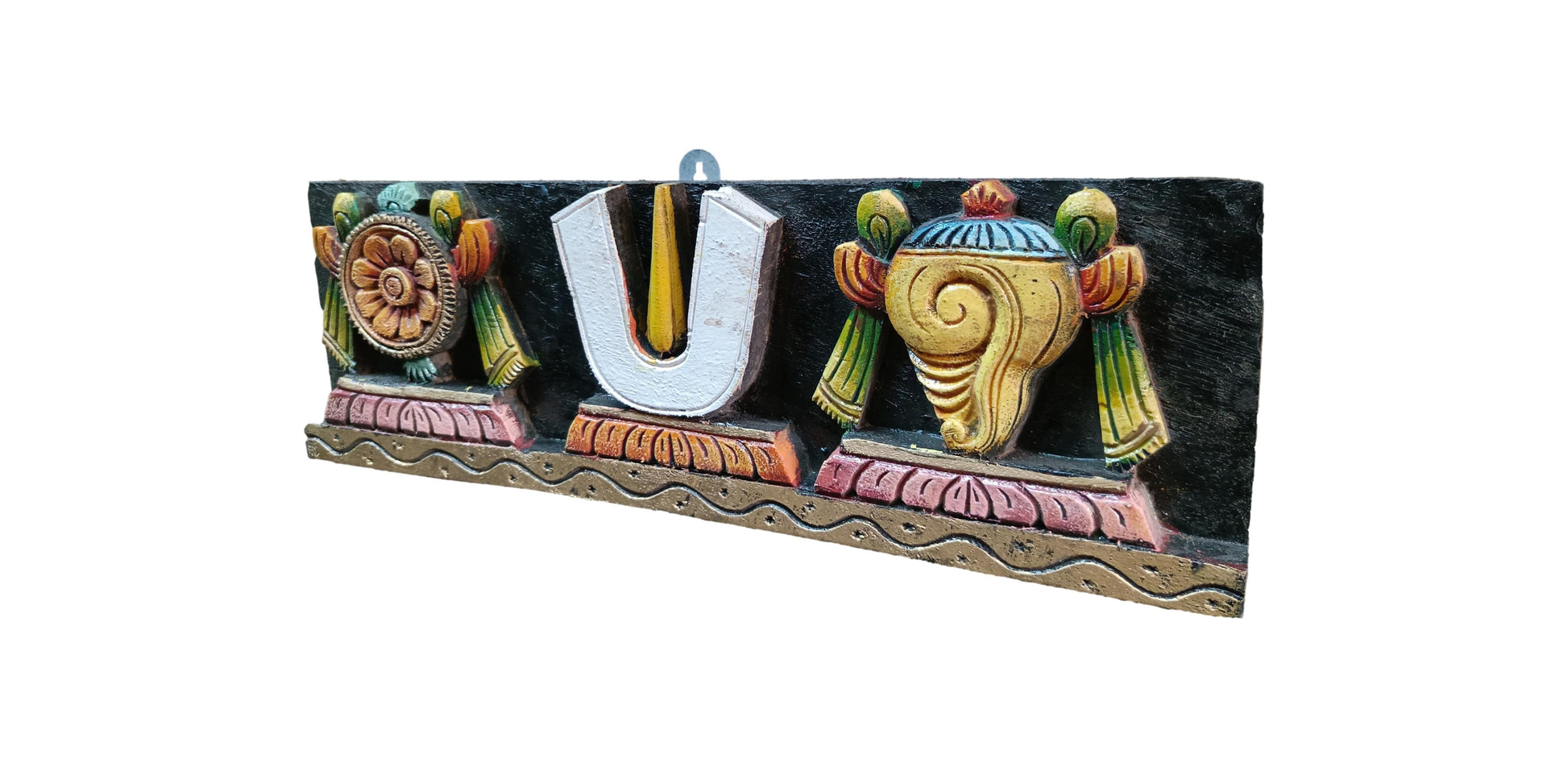 Featuring the revered Tiruman (Thirunamam) flanked by Shanku (conch) and Chakram (discus), this wall hanging is ideal for puja rooms, altars, entrances, or as a meaningful gift for religious occasions. The craftsmanship highlights rich South Indian heritage, making it a perfect blend of devotion and artistry.